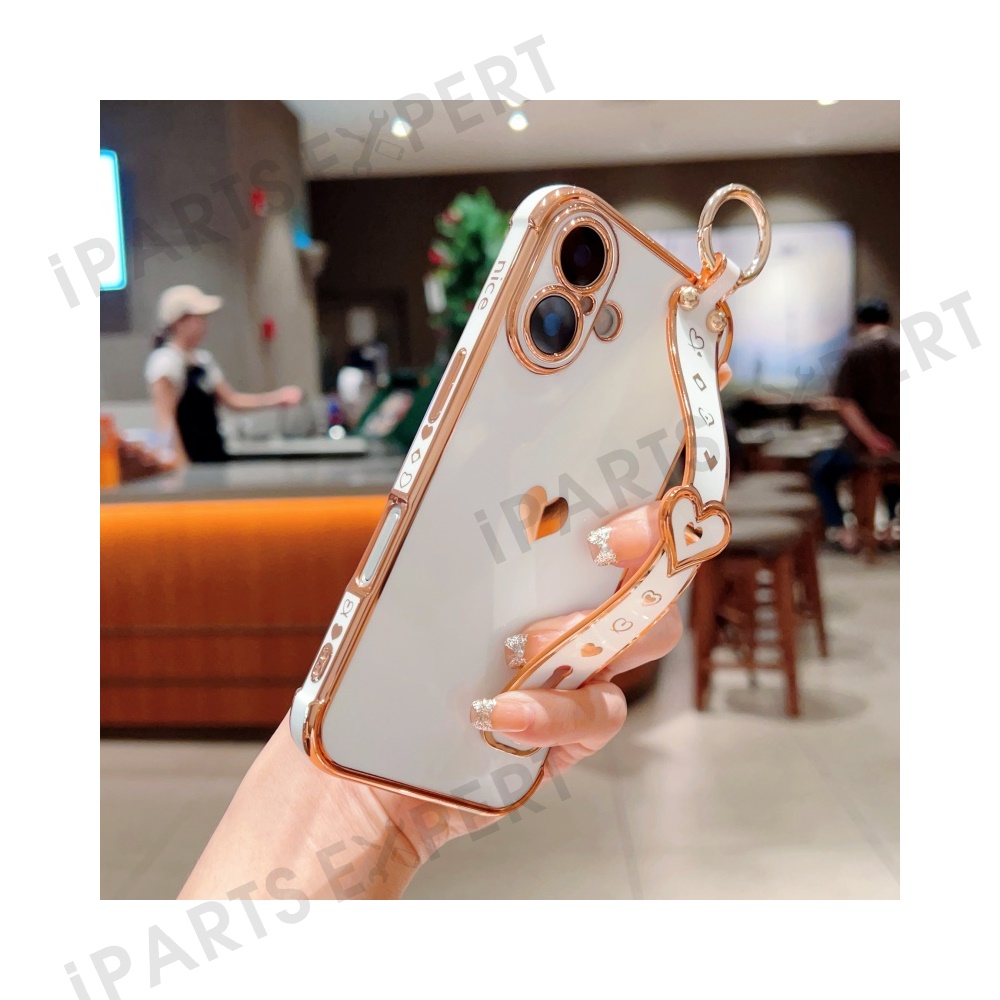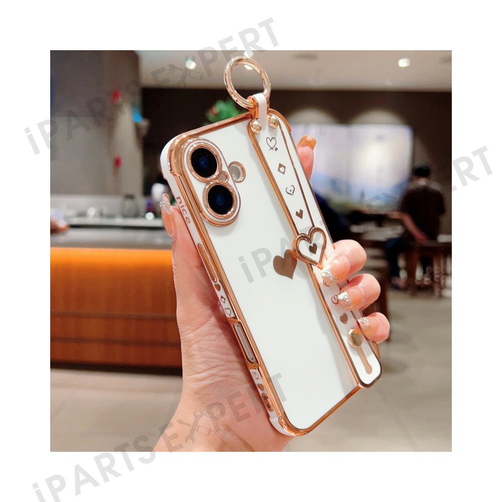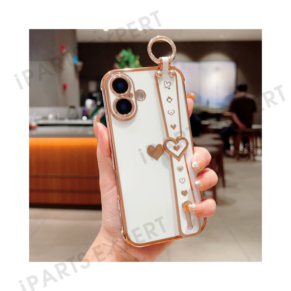 For iPhone 16 Plus Case Wristband Kickstand Love Heart TPU Phone Cover Finger Holder - Ivory White