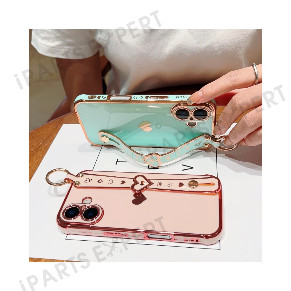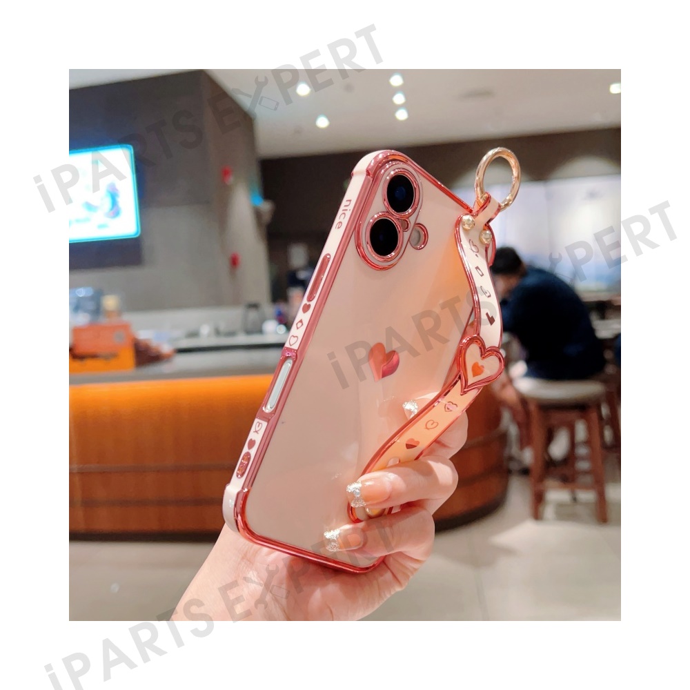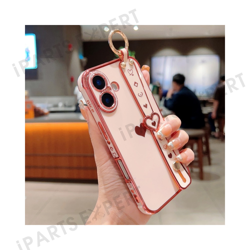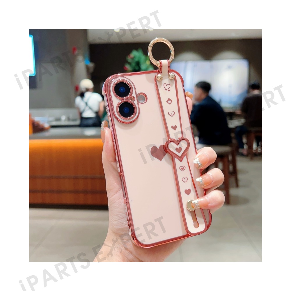 For iPhone 16 Plus Case Wristband Kickstand Love Heart TPU Phone Cover Finger Holder - Pink