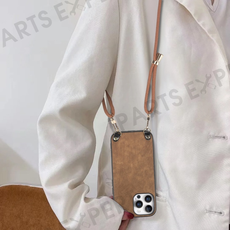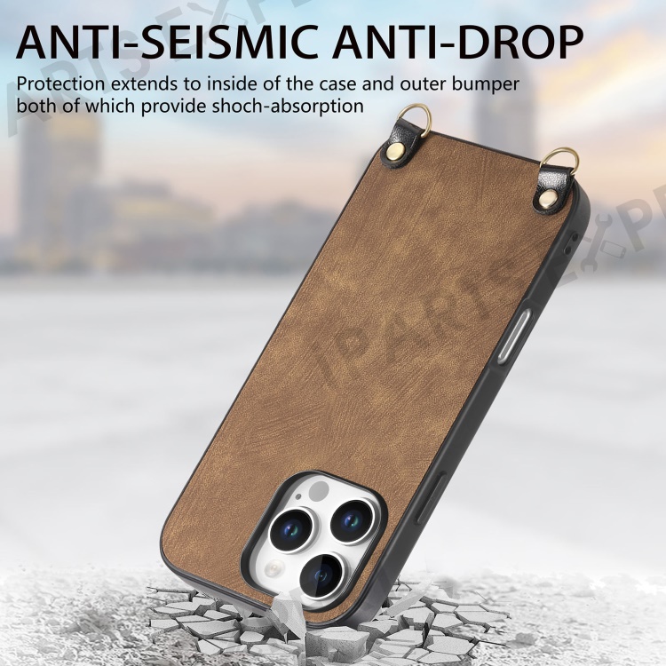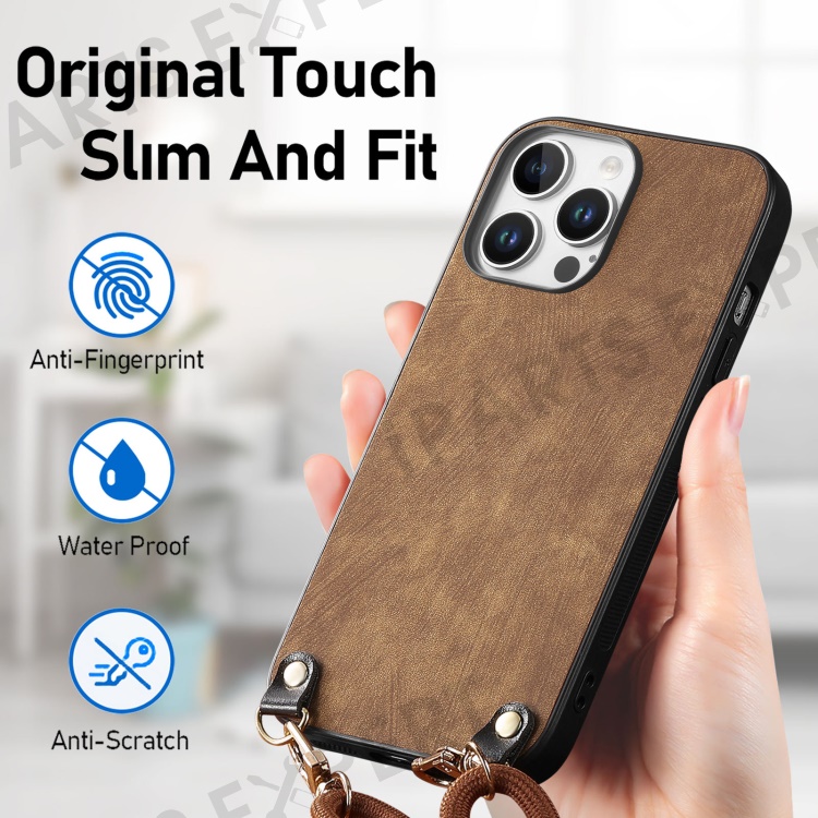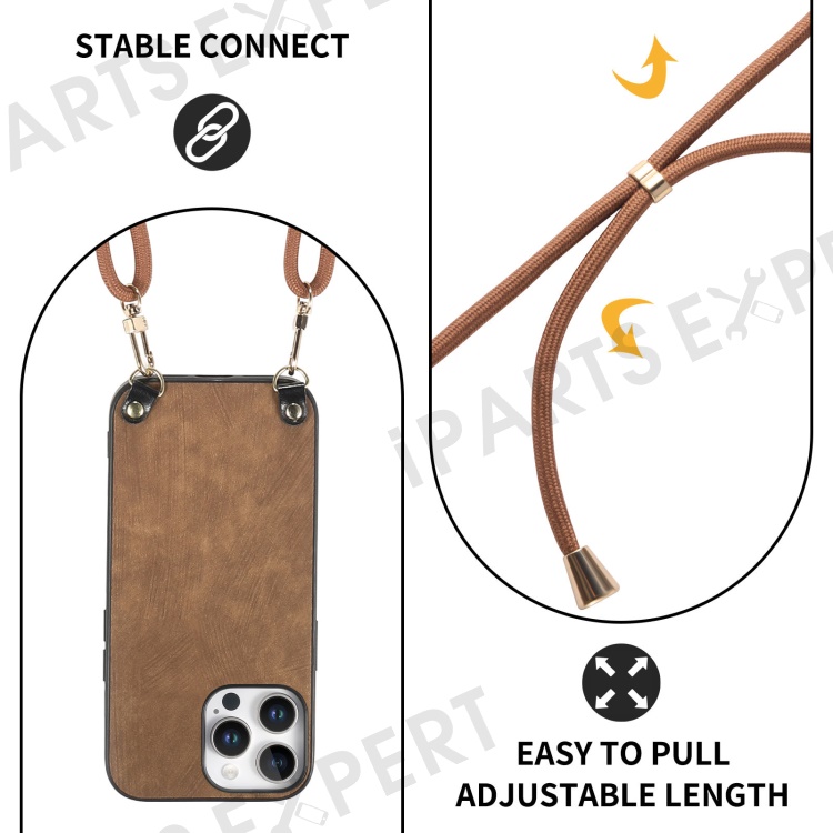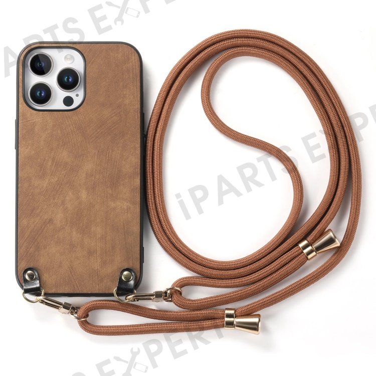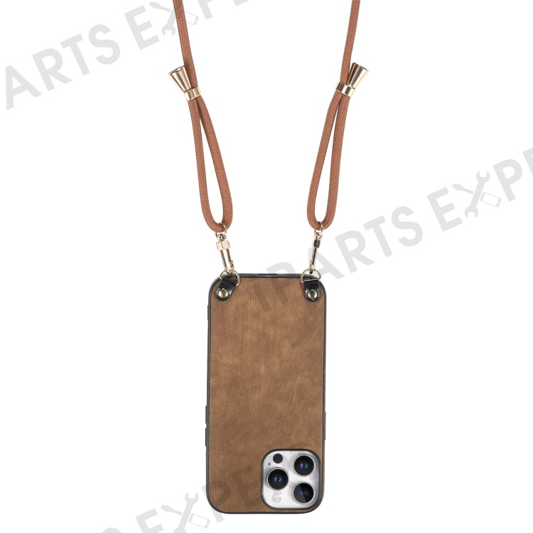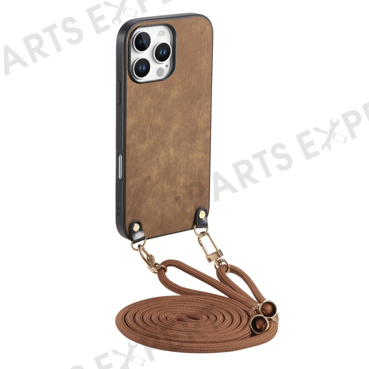 For iPhone 16 Pro Case Retro Texture Leather Coated PC+TPU Phone Cover with Hanging Rope - Brown