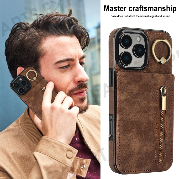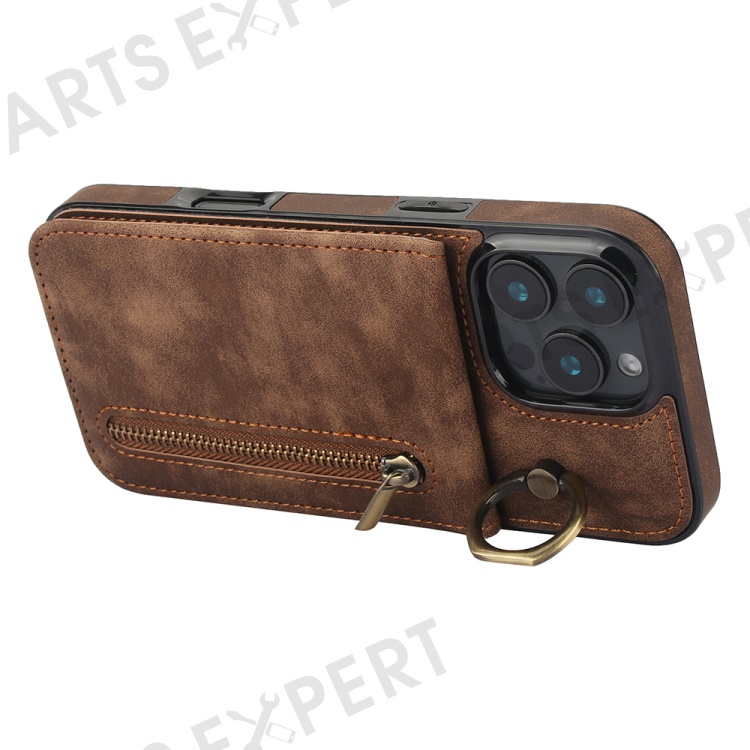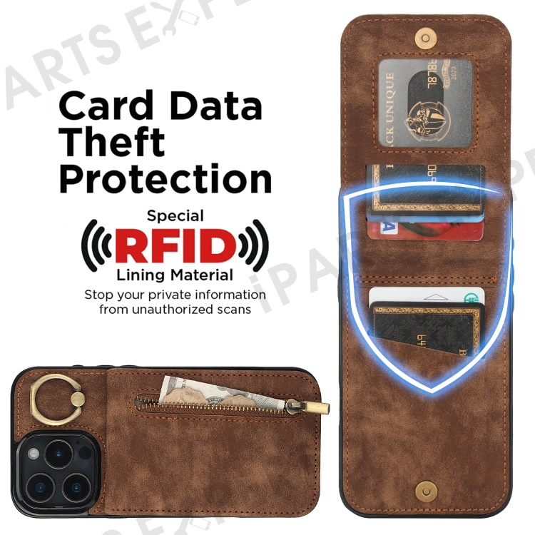 For iPhone 16 Pro Case RFID Blocking Ring Kickstand Retro Leather+TPU Anti-fall Phone Cover - Brown