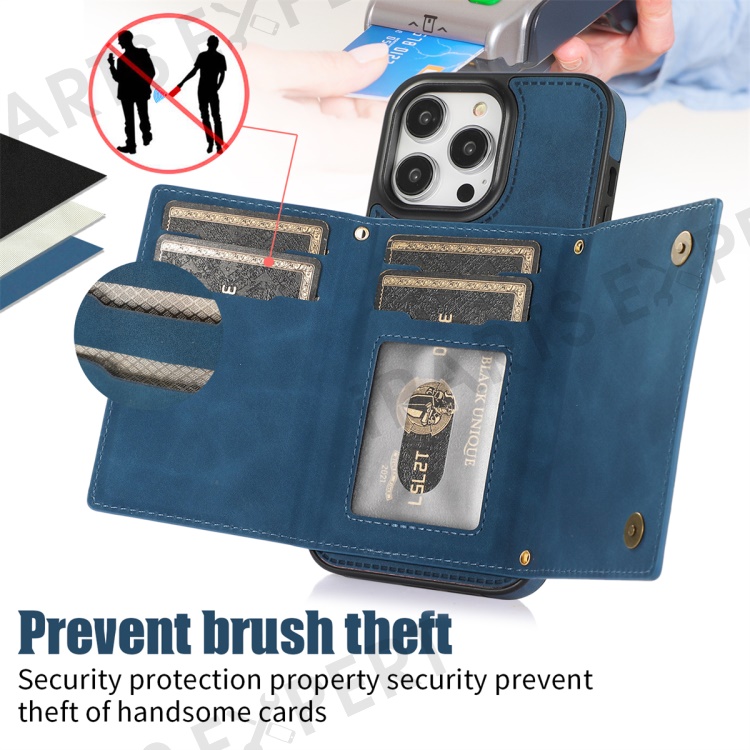 For iPhone 16 Pro Case Wallet RFID Blocking TPU Leather Phone Cover with Lanyard - Blue