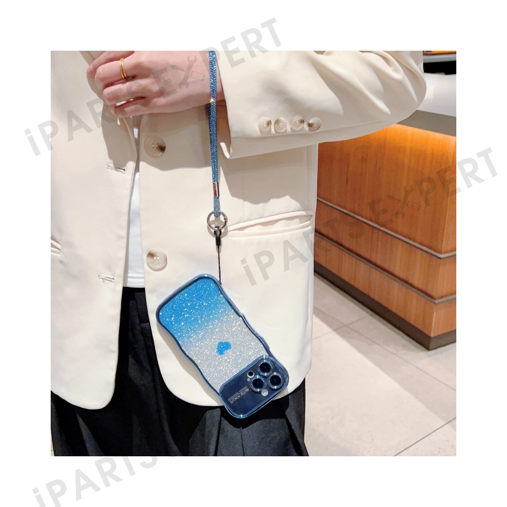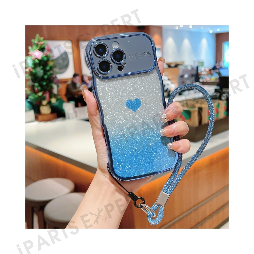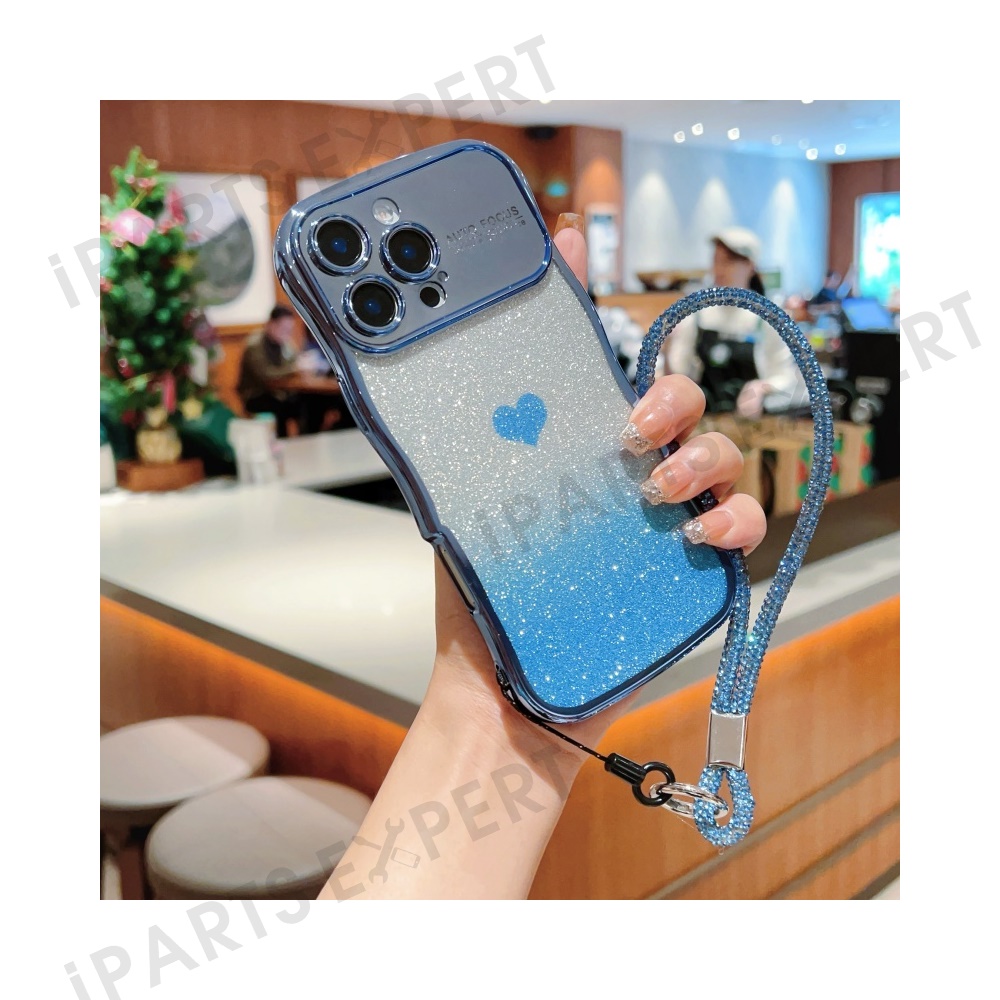 For iPhone 16 Pro Case with Strap Electroplating TPU Phone Cover Love Heart Gradient Glitter - Blue