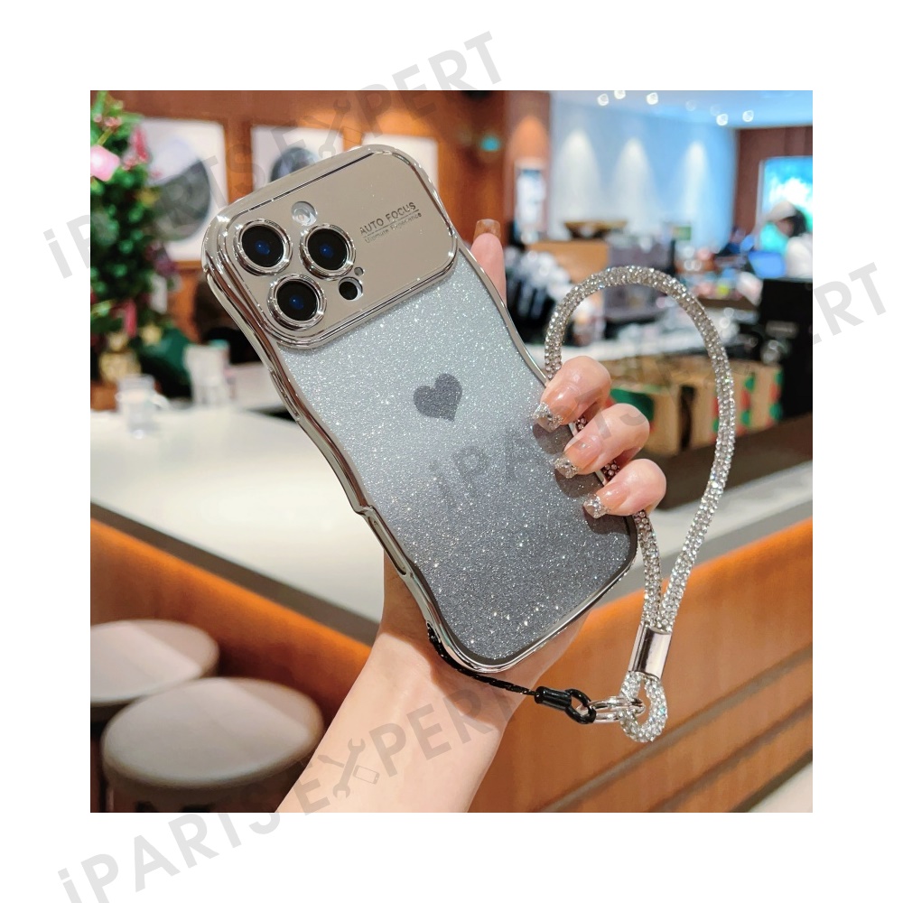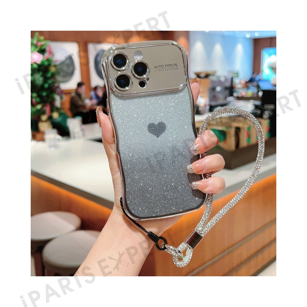 For iPhone 16 Pro Case with Strap Electroplating TPU Phone Cover Love Heart Gradient Glitter - Silver