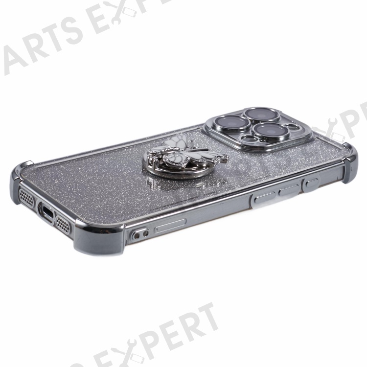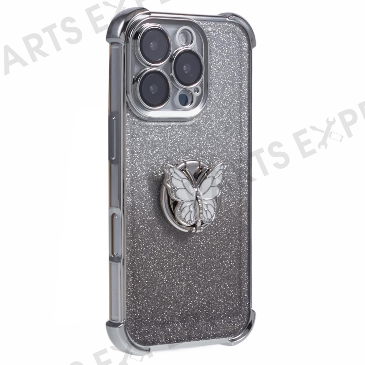 For iPhone 16 Pro Max Case Butterfly Kickstand Glitter TPU Shockproof Phone Cover - Silver