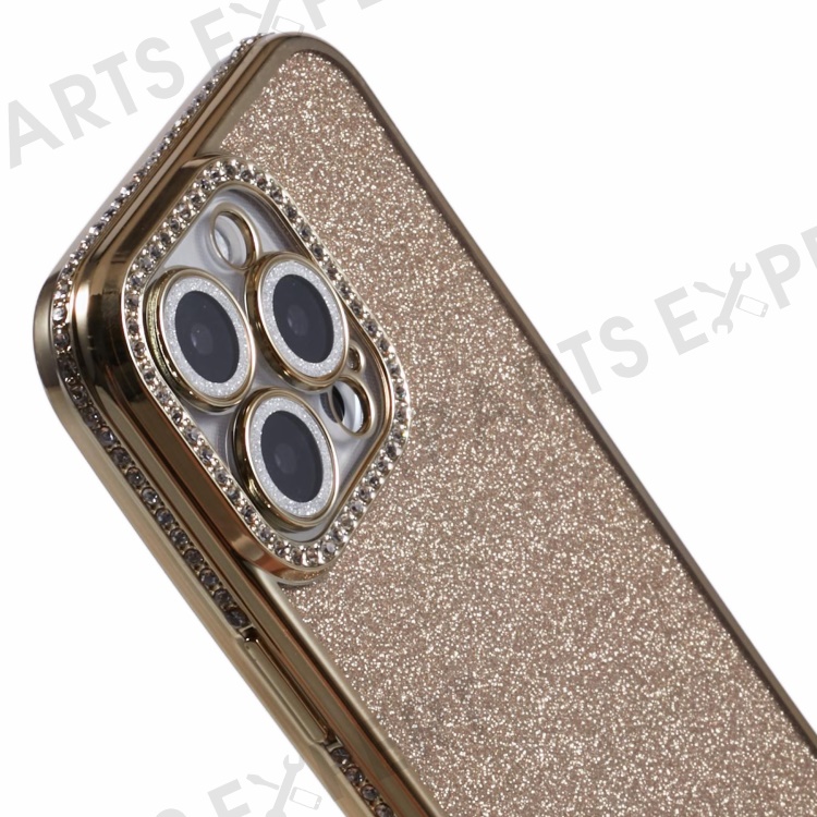 For iPhone 16 Pro Max Case Camera Lens Guard Clear Phone Back Cover Rhinestone Decor With Glitter Paper - Gold