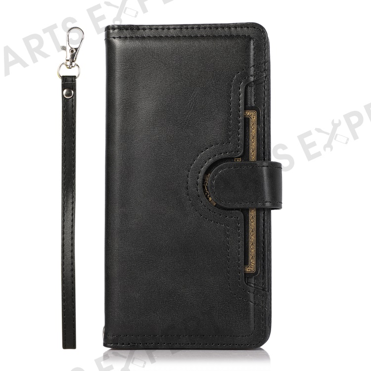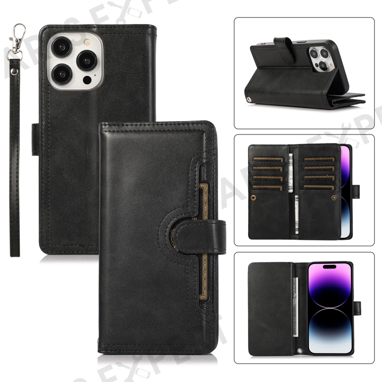 For iPhone 16 Pro Max Case Split Leather Magnetic Wallet Phone Protector with Wrist Strap - Black