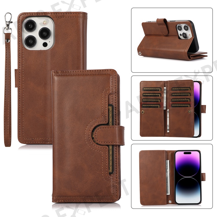 For iPhone 16 Pro Max Case Split Leather Magnetic Wallet Phone Protector with Wrist Strap - Coffee