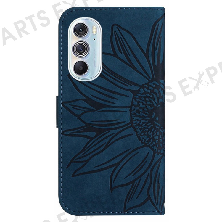 For Motorola Edge 30 Pro (Motorola Edge+ (2022)) Well-protected Imprinted Sunflower PU Leather Case Stand Wallet Skin-touch Phone Cover with Strap - Dark Blue