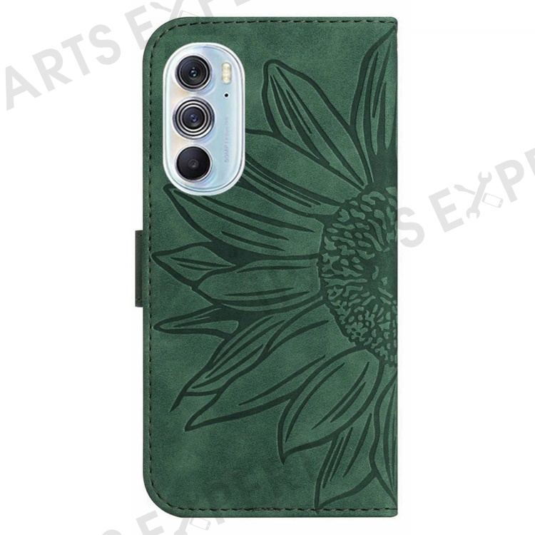 For Motorola Edge 30 Pro (Motorola Edge+ (2022)) Well-protected Imprinted Sunflower PU Leather Case Stand Wallet Skin-touch Phone Cover with Strap - Dark Green