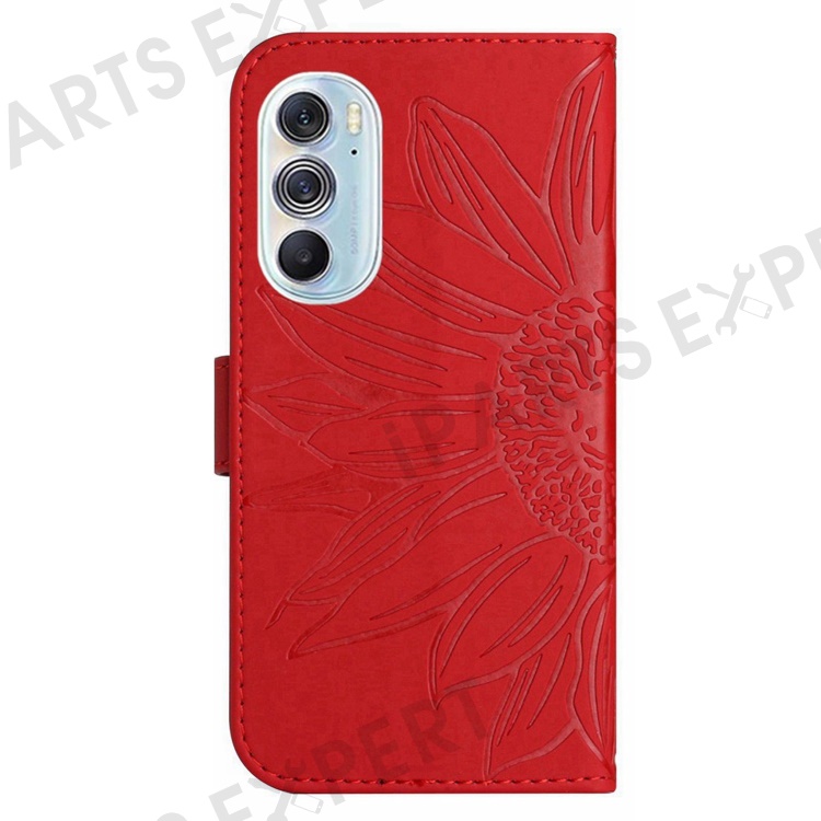 For Motorola Edge 30 Pro (Motorola Edge+ (2022)) Well-protected Imprinted Sunflower PU Leather Case Stand Wallet Skin-touch Phone Cover with Strap - Red