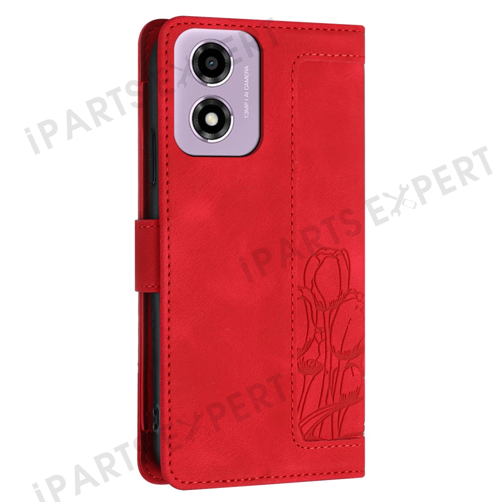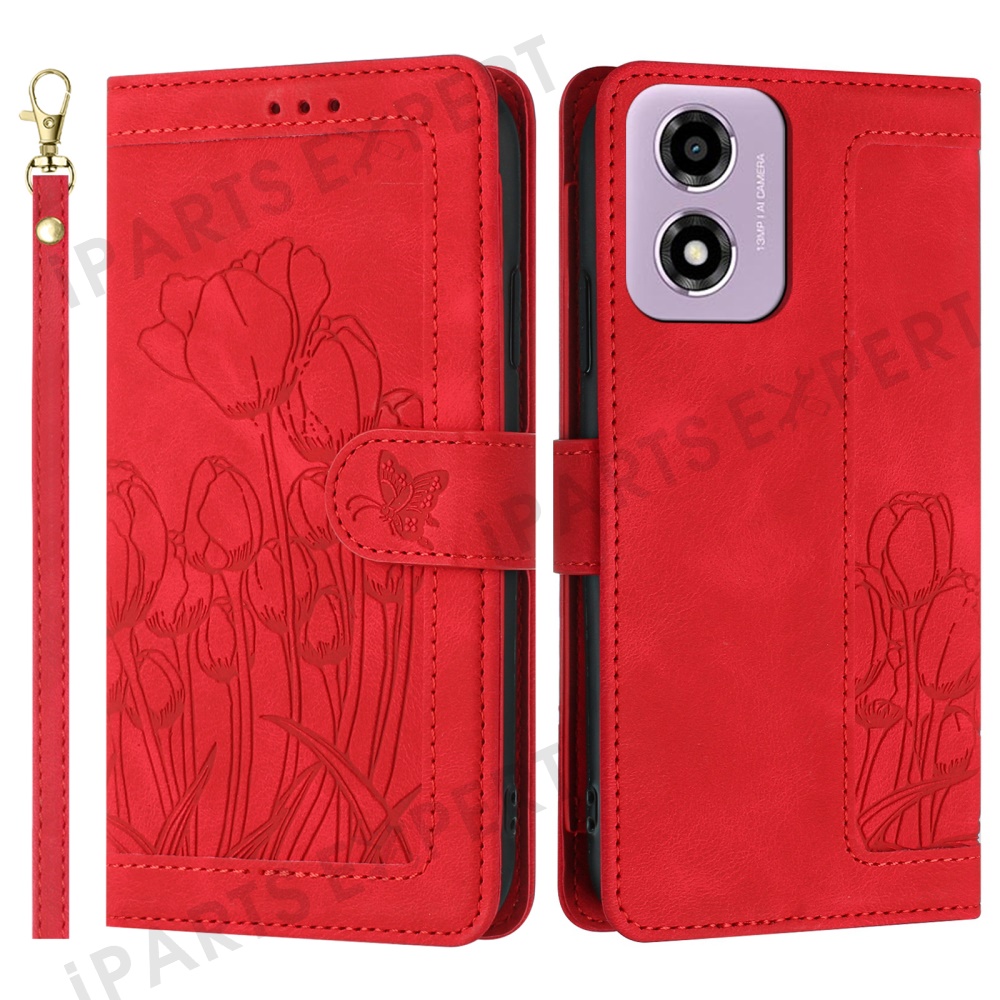 For Motorola Moto E14 4G Tulip Leather Case Phone Cover with 5 Card Slots Wallet - Red