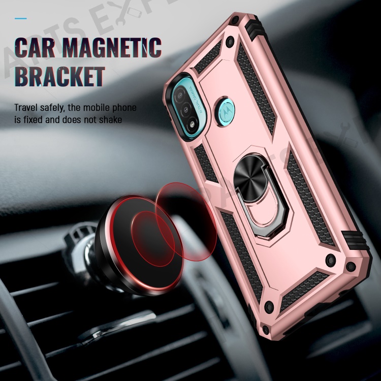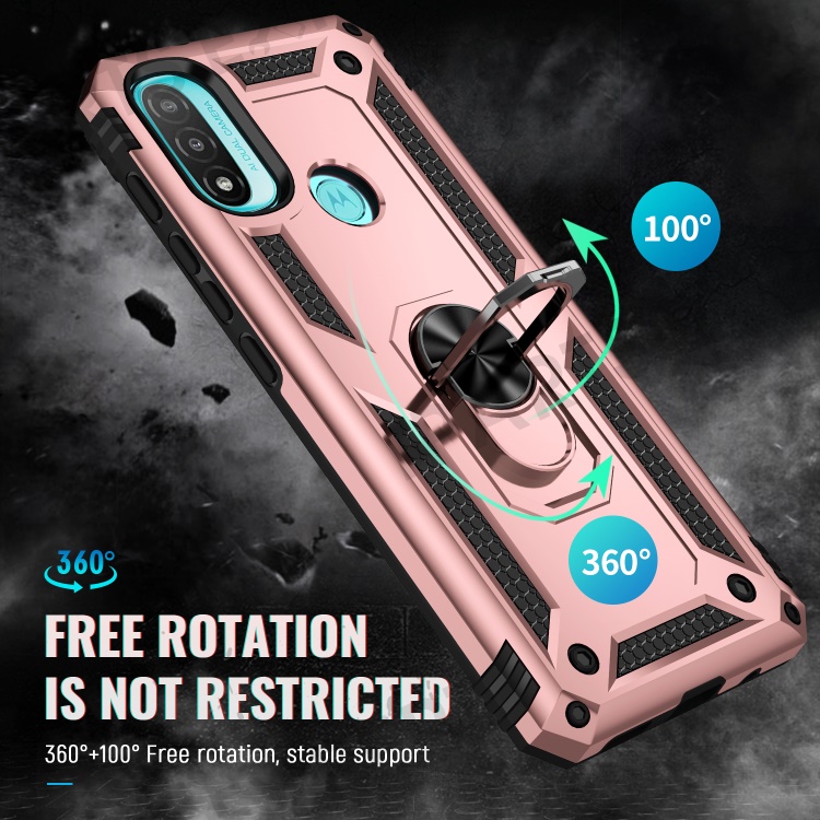 For Motorola Moto E20 Military Grade Drop-Proof PC + TPU Hybrid Cell Phone Case with Rotatory Ring Kickstand - Rose Gold