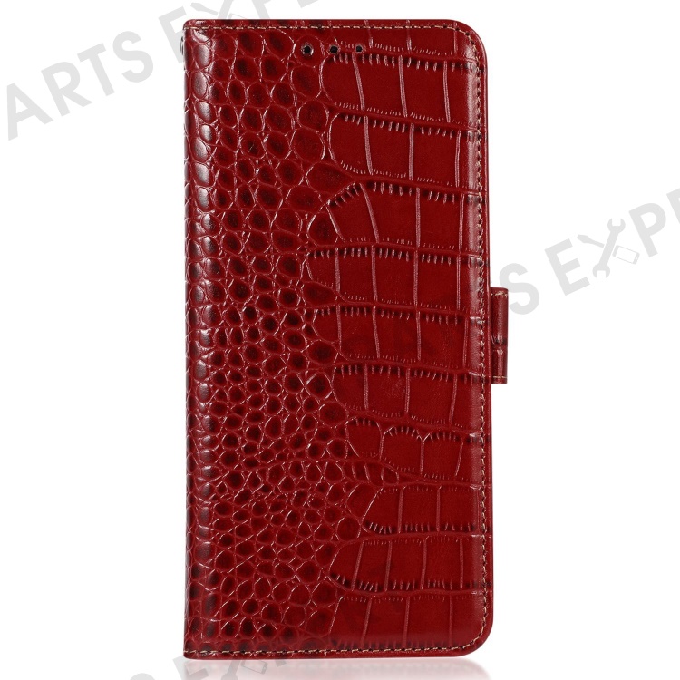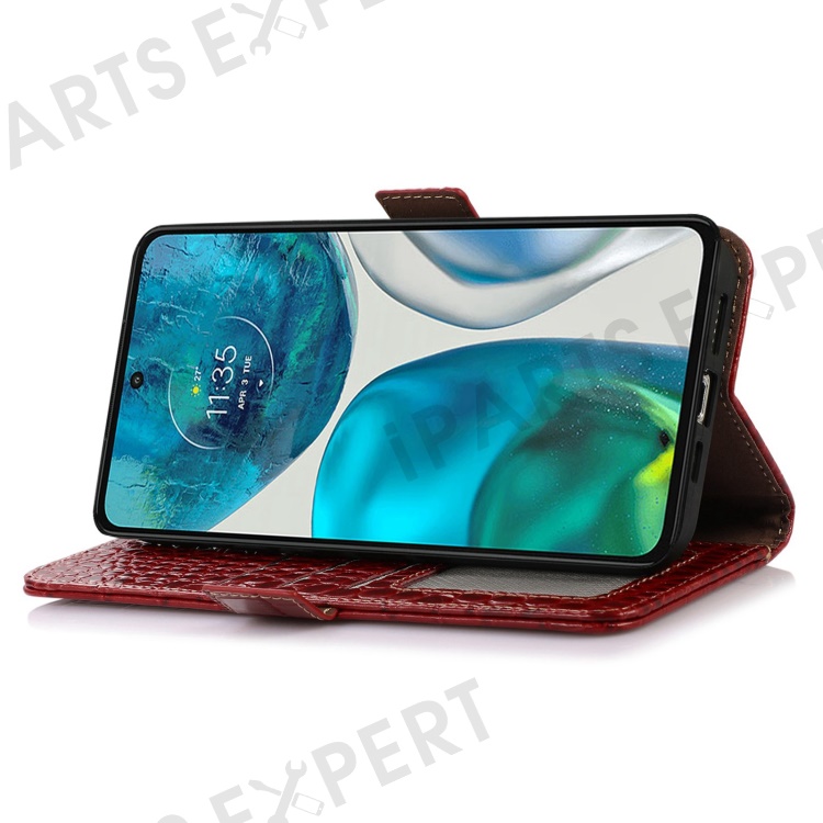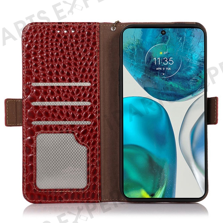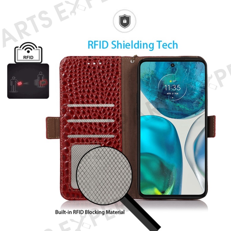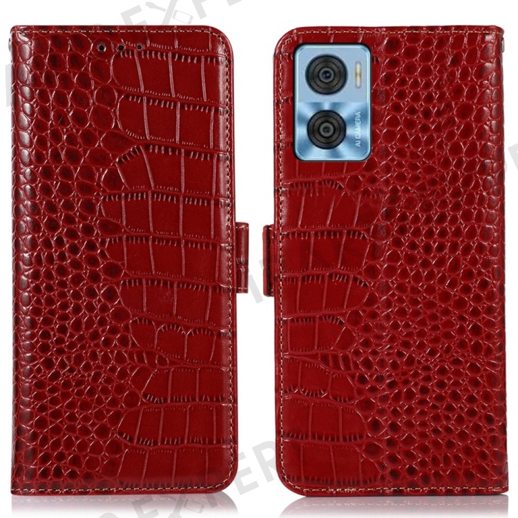 For Motorola Moto E22 4G / E22i 4G Genuine Cowhide Leather Flip Folio Case RFID Blocking Stand Crocodile Texture Wallet Phone Cover - Red