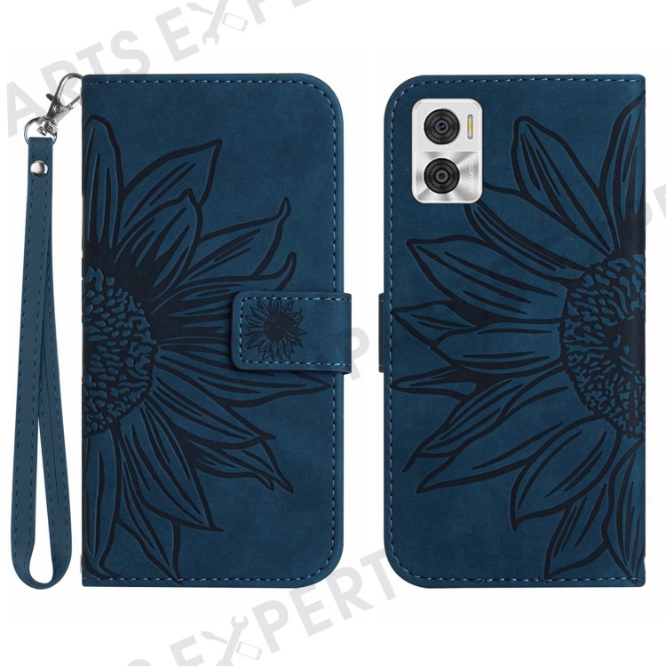 For Motorola Moto E22 4G / E22i 4G HT04 Sunflower Imprinted PU Leather Anti-scratch Stand Shell Skin-Touch Phone Wallet Cover with Hand Strap - Dark Blue