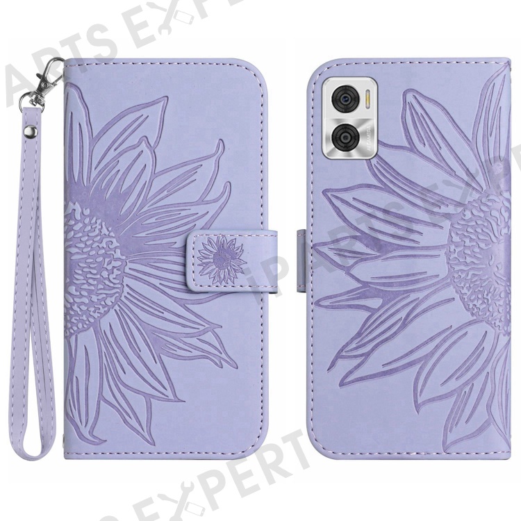 For Motorola Moto E22 4G / E22i 4G HT04 Sunflower Imprinted PU Leather Anti-scratch Stand Shell Skin-Touch Phone Wallet Cover with Hand Strap - Light Purple