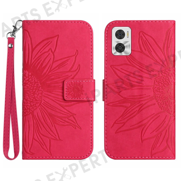 For Motorola Moto E22 4G / E22i 4G HT04 Sunflower Imprinted PU Leather Anti-scratch Stand Shell Skin-Touch Phone Wallet Cover with Hand Strap - Rose