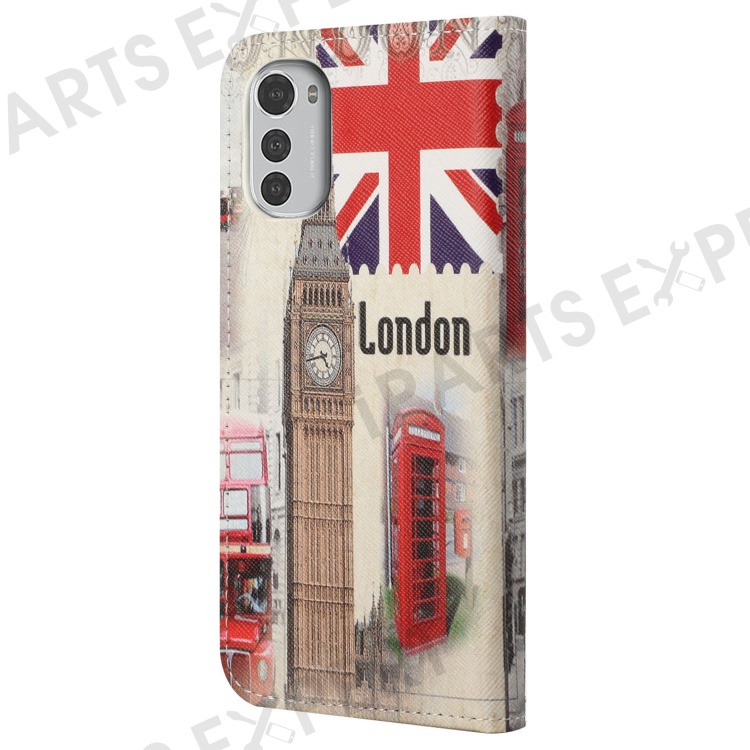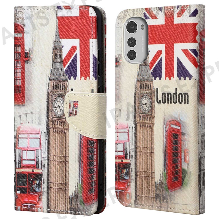 For Motorola Moto E32 Pattern Printing Wallet Case Cross Texture PU Leather Magnetic Clasp Protect Stand Cover with Wrist Strap - London Big Ben