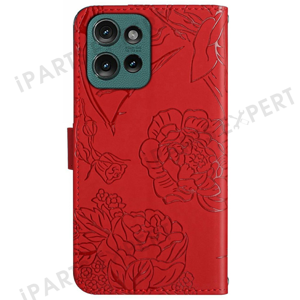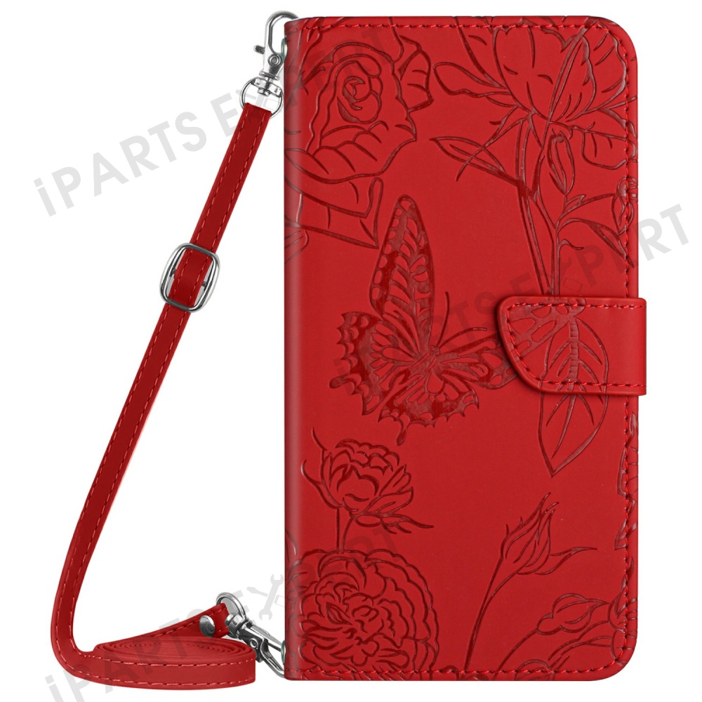 For Motorola Moto G 5G (2025) Case Butterfly Flower Imprint Leather Phone Cover with Shoulder Strap - Red