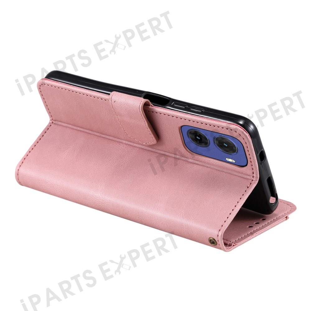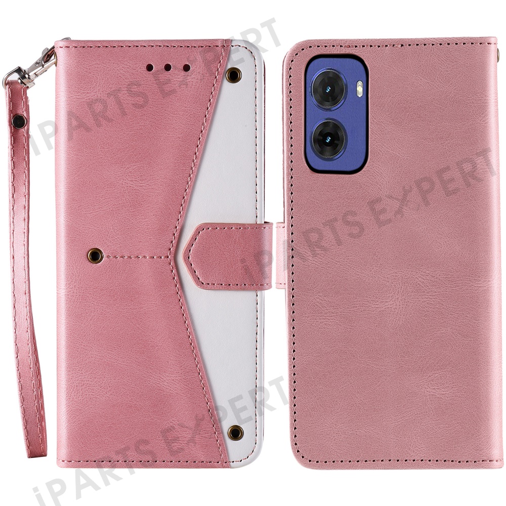 For Motorola Moto G05 4G Leather Case Splicing Stitching Wallet Stand Phone Cover with Strap - Rose Gold