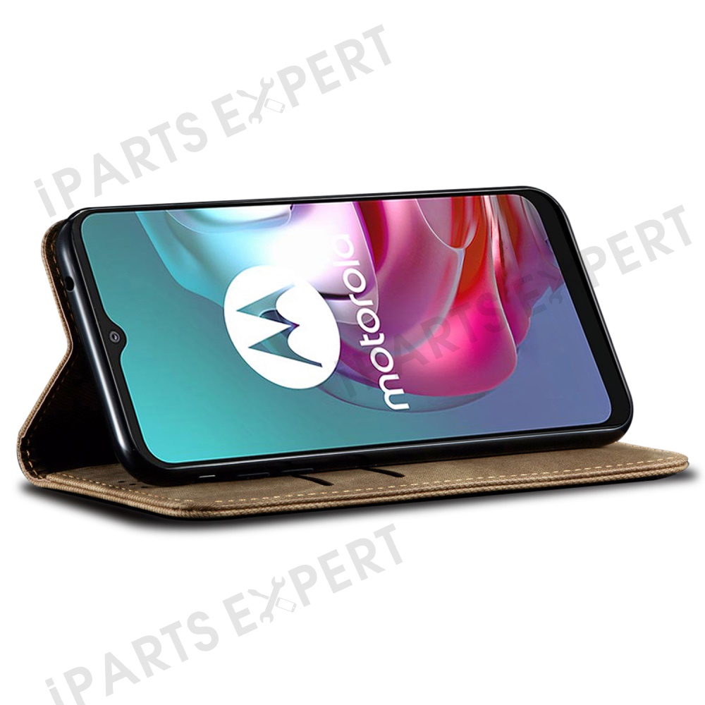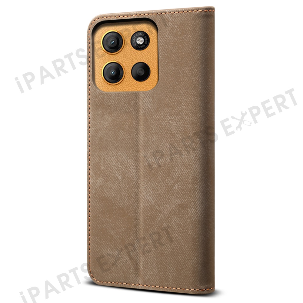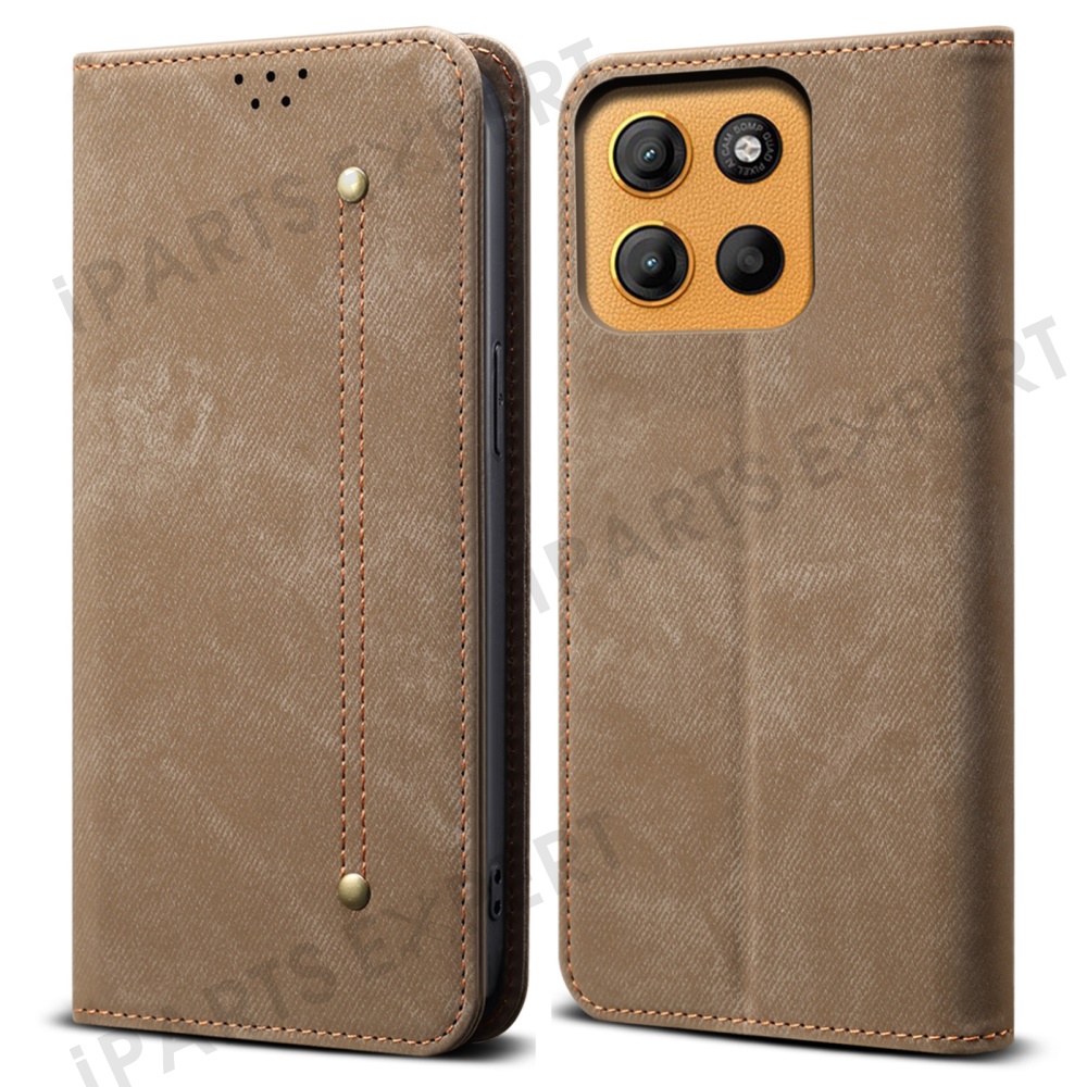 For Motorola Moto G15 4G Case Jeans Cloth Texture Anti-Scratch Leather Stand Phone Cover - Khaki
