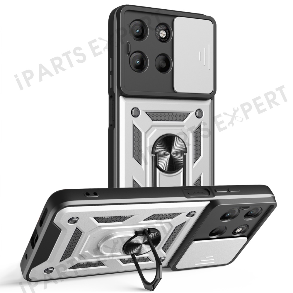 For Motorola Moto G15 4G Case with Slide Camera Lid PC + TPU Kickstand Phone Cover - Silver