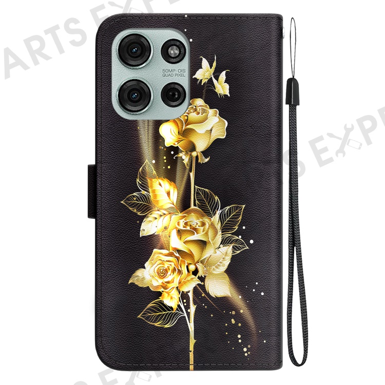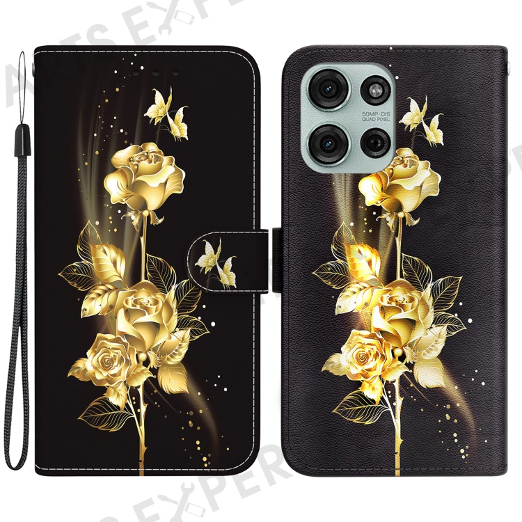 For Motorola Moto G75 5G Wallet Phone Case Anti-Drop Leather Flip Cover Pattern Printing - Gold Butterfly Rose