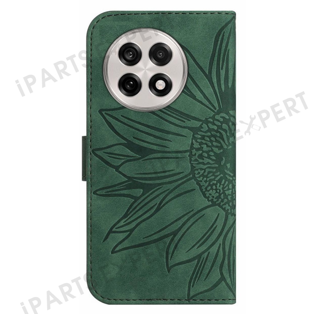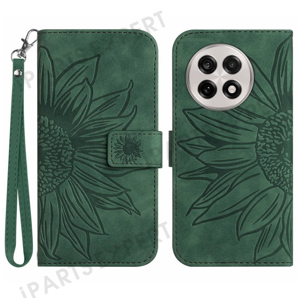 For OnePlus 13 Case Sunflower Imprint Leather Wallet Phone Cover with Wrist Strap - Dark Green
