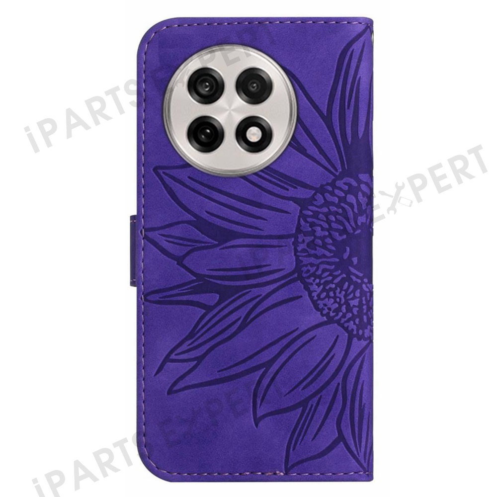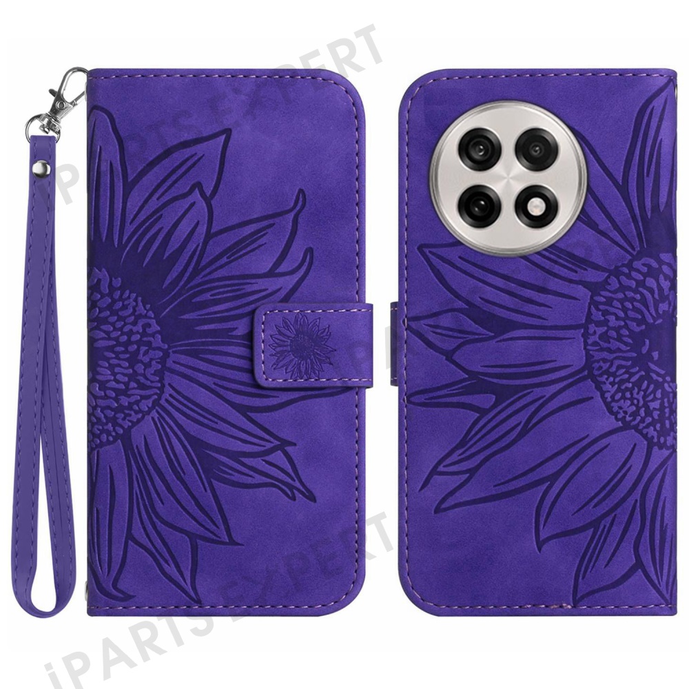 For OnePlus 13 Case Sunflower Imprint Leather Wallet Phone Cover with Wrist Strap - Dark Purple