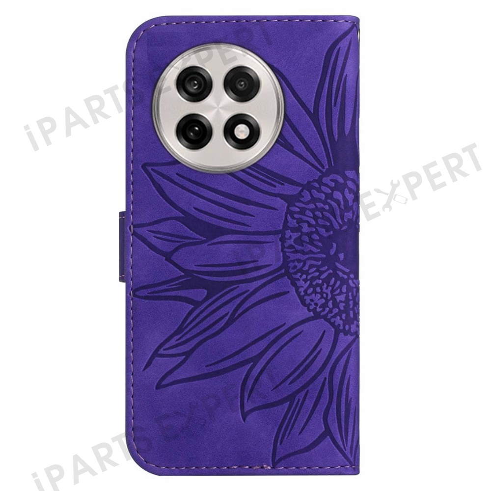 For OnePlus 13R 5G Case Sunflower Imprint PU Leather Phone Cover with Long Strap - Dark Purple