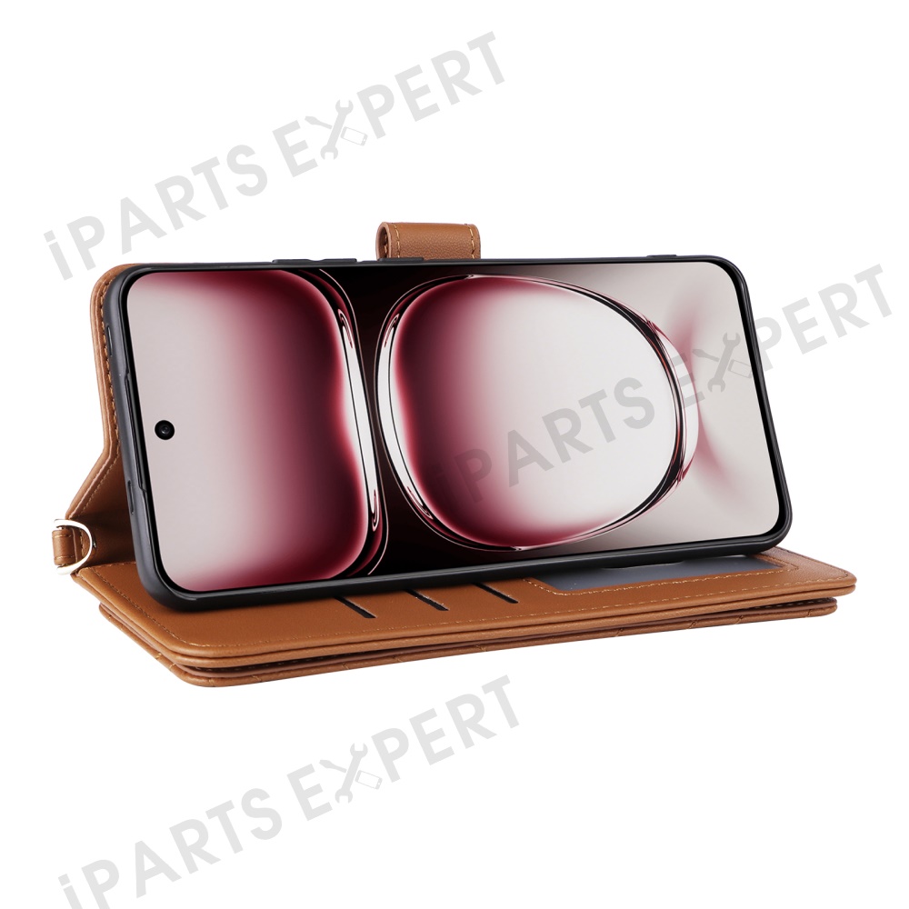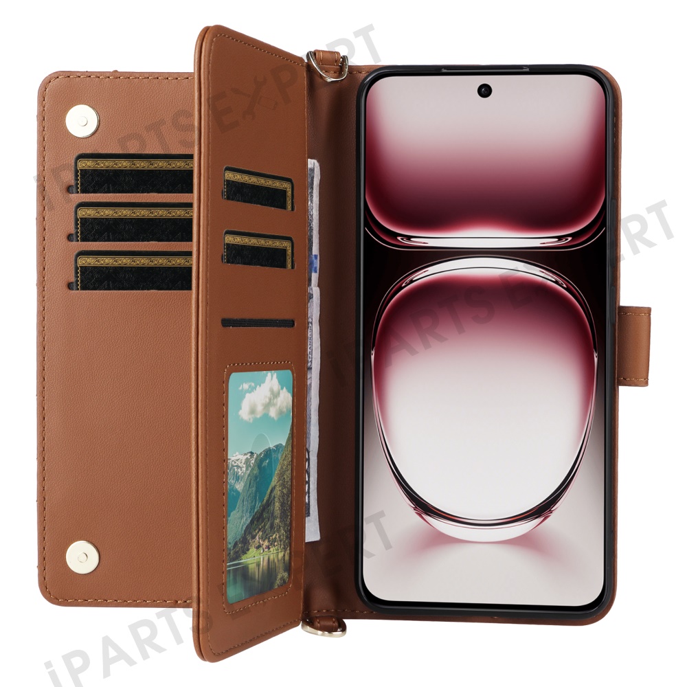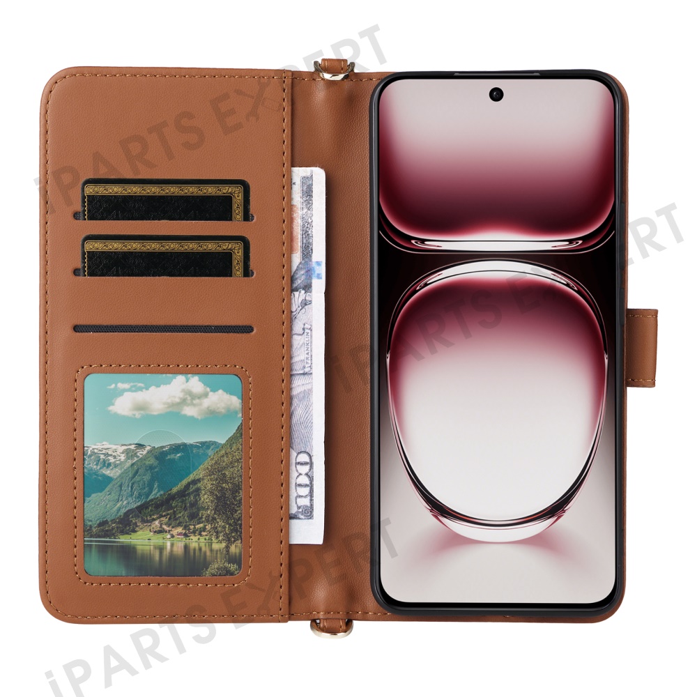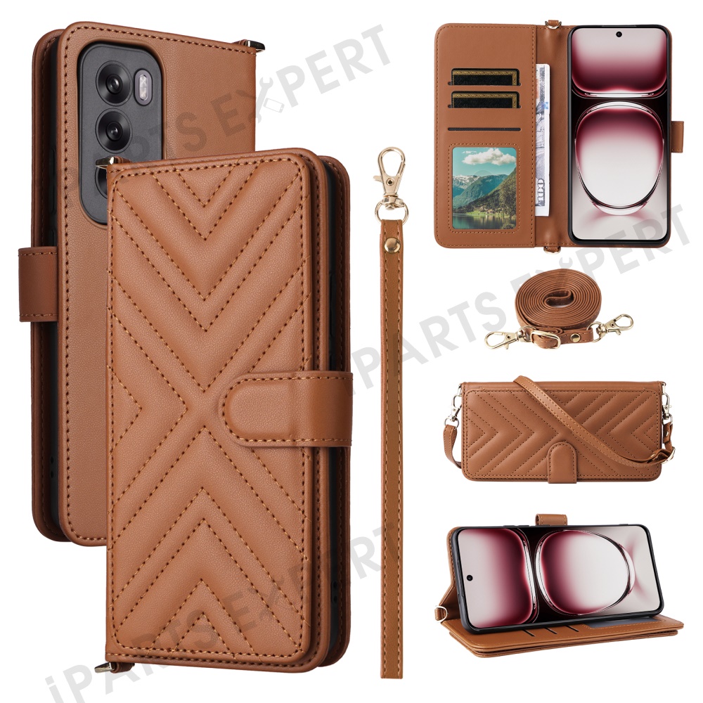 For Oppo Reno12 5G (Global) Wallet Case with Shoulder / Wrist Strap Leather Phone Cover Stand - Brown