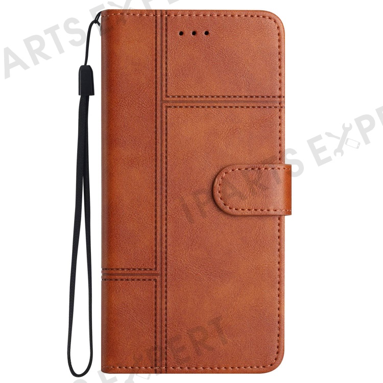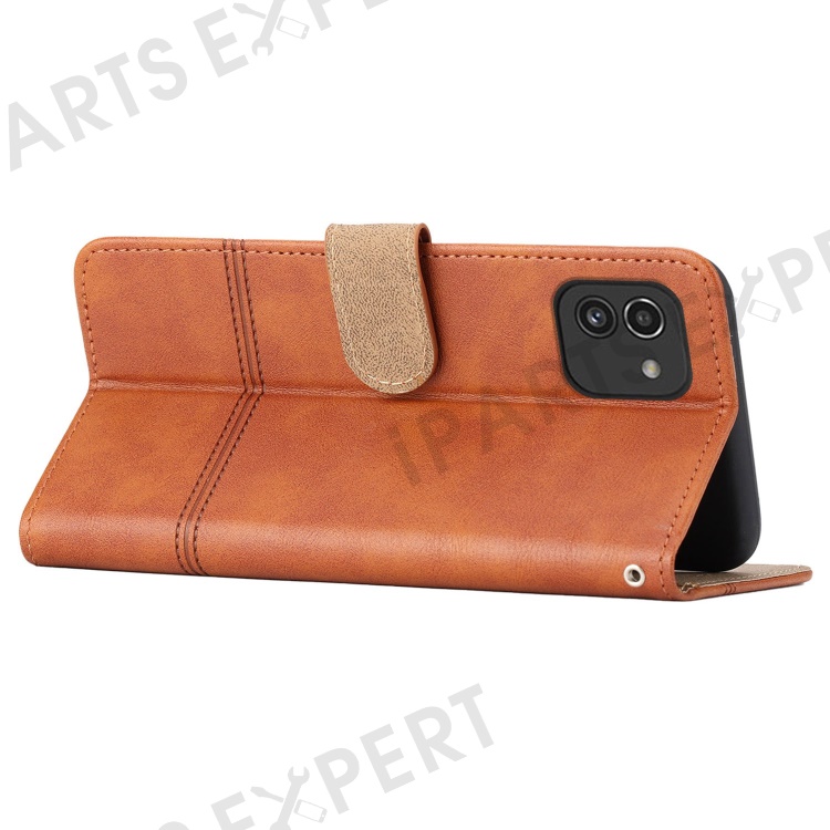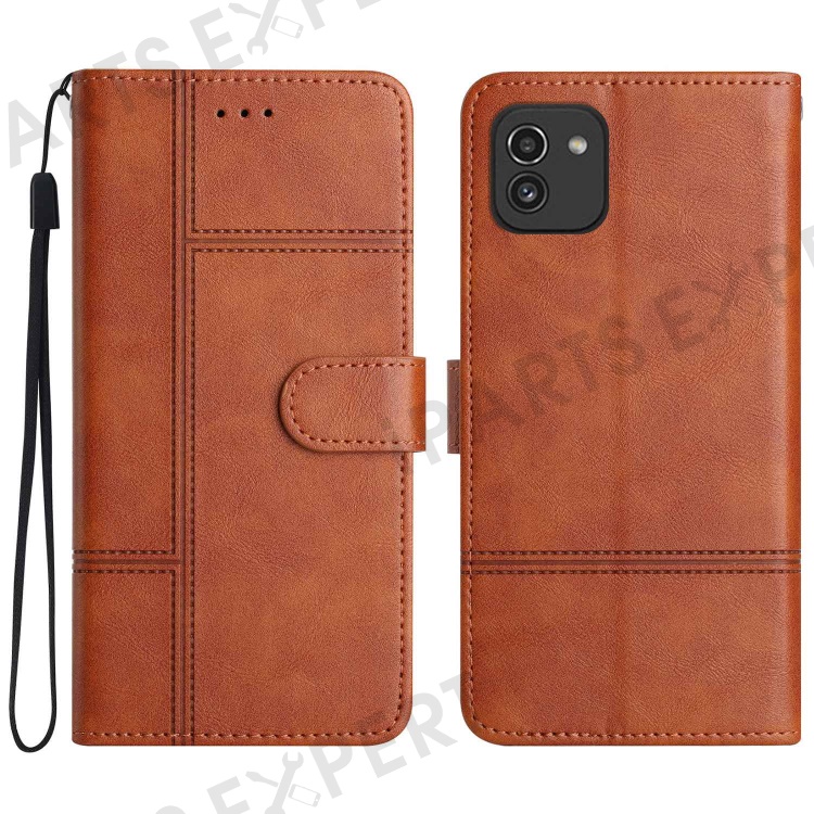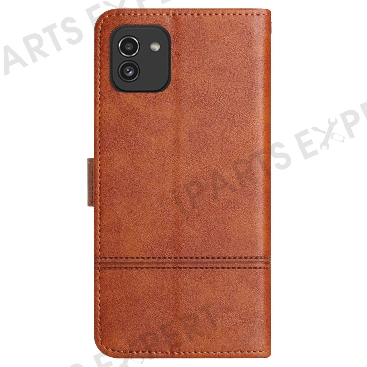 For Samsung Galaxy A03 (164.2mm) Cowhide Texture Business Style PU Leather Cover Sewing Line Decor Wallet Stand Phone Shockproof Case - Brown