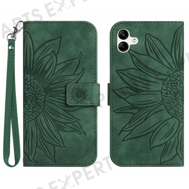 For Samsung Galaxy A04 4G (164.4 x 76.3 x 9.1 mm) HT04 Fall Protection Skin-Touch PU Leather Phone Case Imprinted Sunflower Stand Wallet Cover with Hand Strap - Dark Green