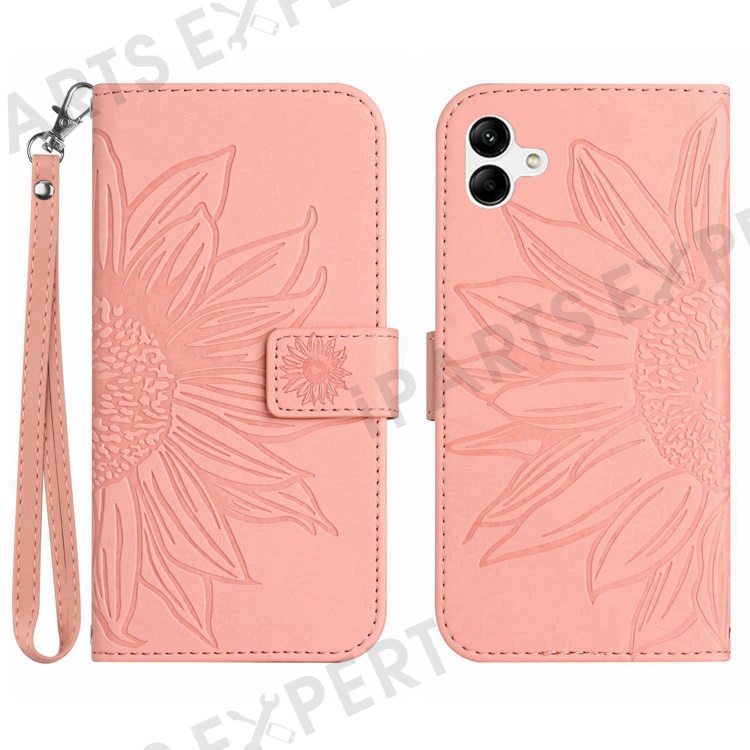 For Samsung Galaxy A04 4G (164.4 x 76.3 x 9.1 mm) HT04 Fall Protection Skin-Touch PU Leather Phone Case Imprinted Sunflower Stand Wallet Cover with Hand Strap - Light Pink