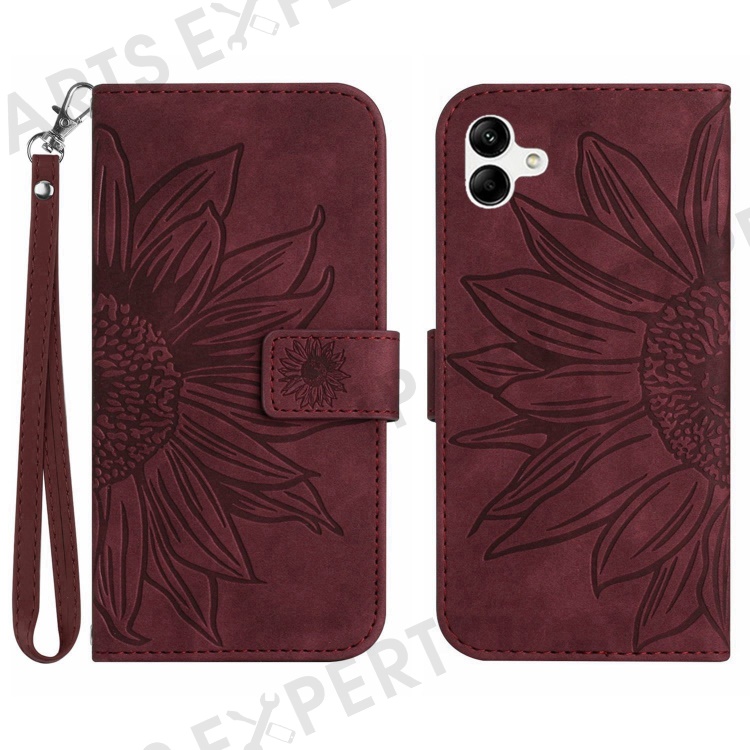 For Samsung Galaxy A04 4G (164.4 x 76.3 x 9.1 mm) HT04 Fall Protection Skin-Touch PU Leather Phone Case Imprinted Sunflower Stand Wallet Cover with Hand Strap - Wine Red
