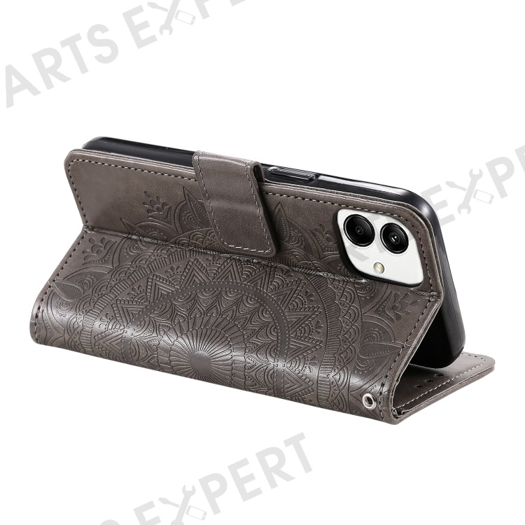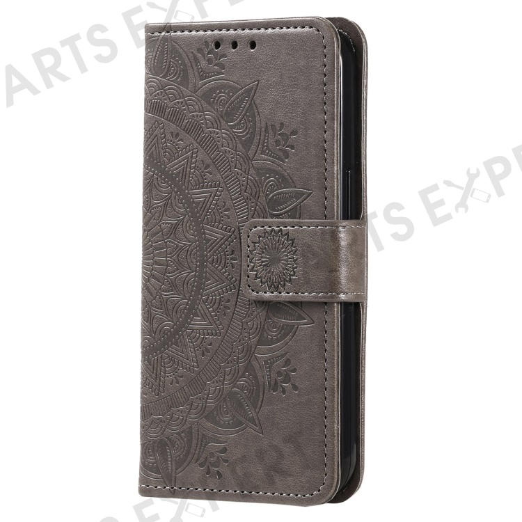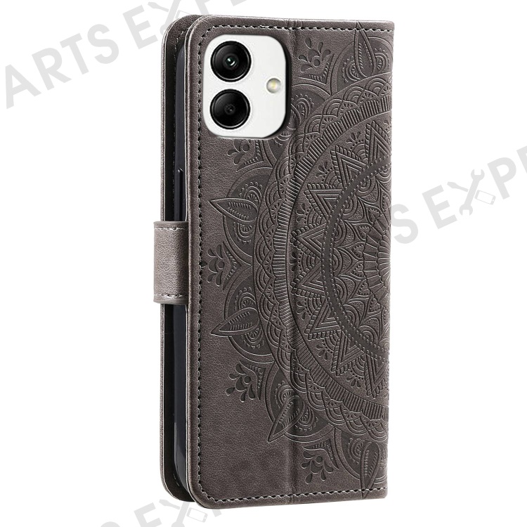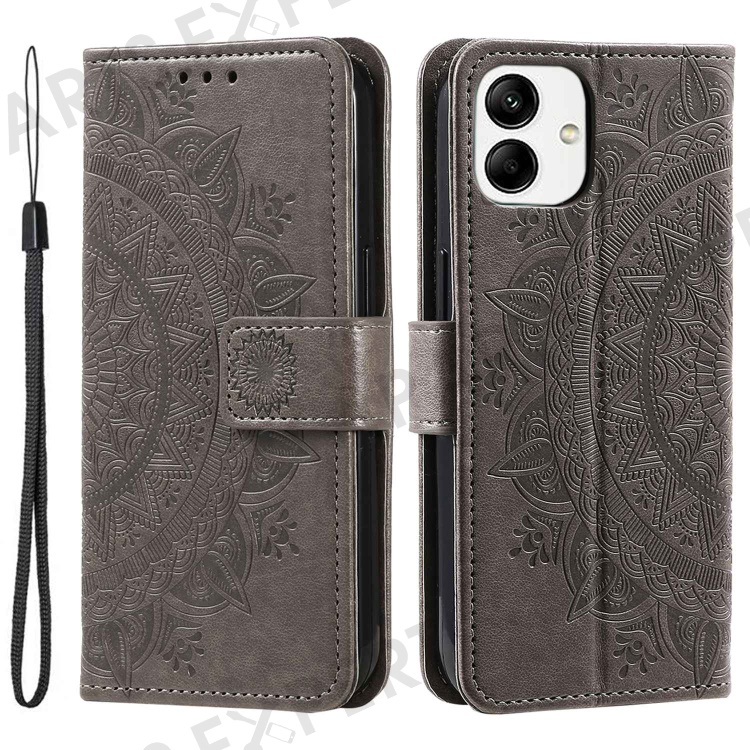 For Samsung Galaxy A04 4G (164.4 x 76.3 x 9.1 mm) Mandala Flower Pattern Imprinted Stand Case Shockproof PU Leather Wallet Phone Cover - Grey