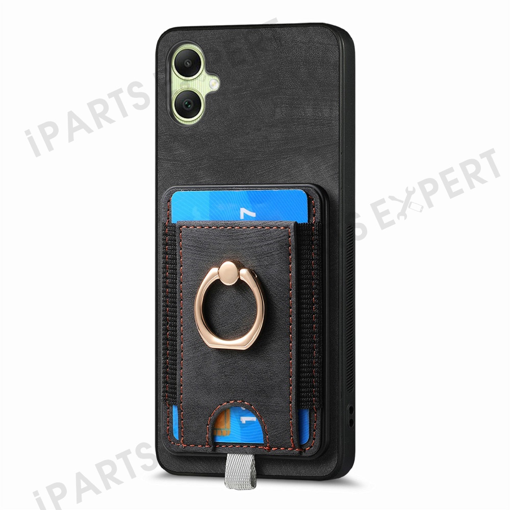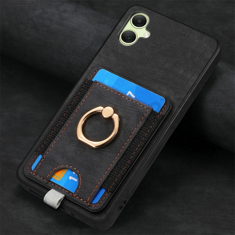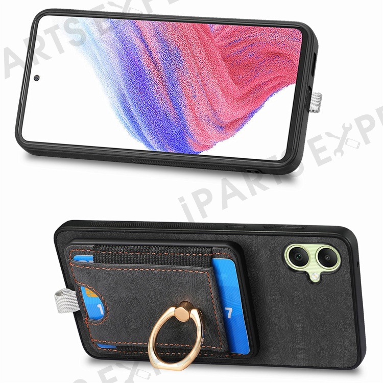 For Samsung Galaxy A06 4G Magnetic Case Card Holder Ring Kickstand PU Leather Phone Back Cover - Black