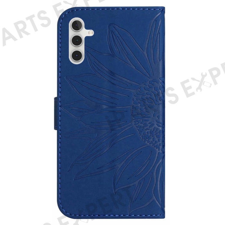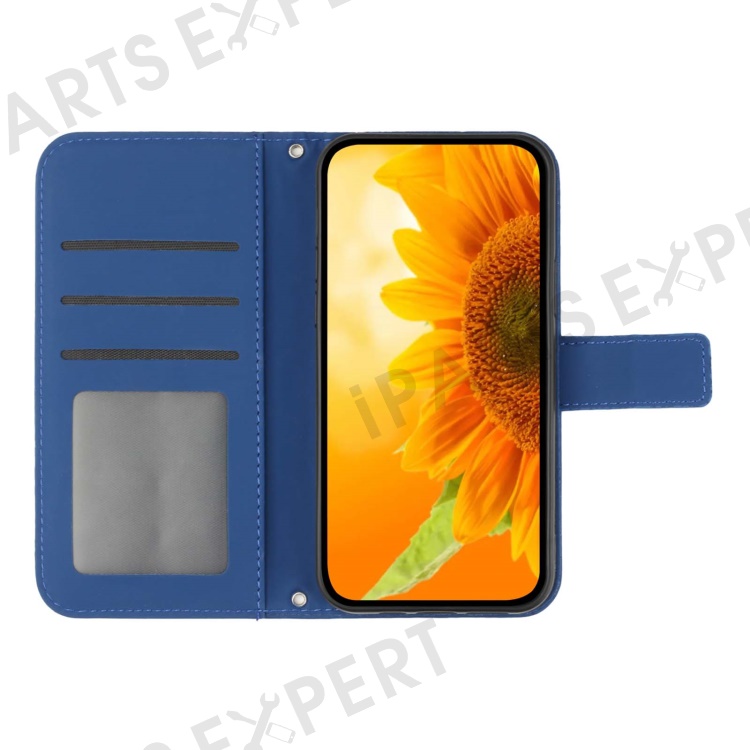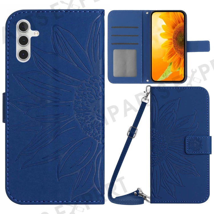 For Samsung Galaxy A14 5G / A14 4G HT04 PU Leather Stand Case Imprinted Sunflower Wallet Cover with Shoulder Strap - Sapphire