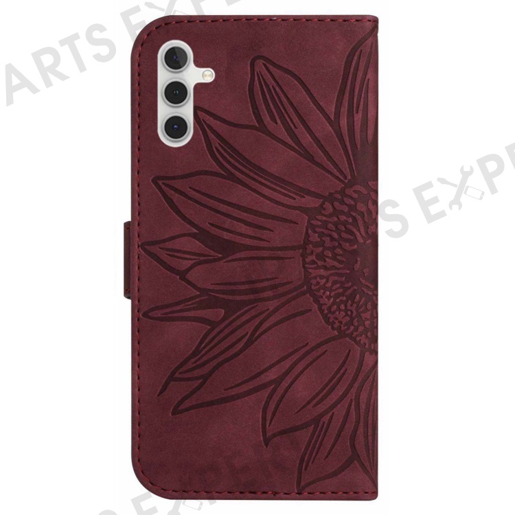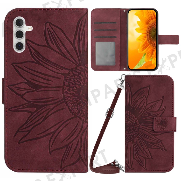 For Samsung Galaxy A14 5G / A14 4G HT04 PU Leather Stand Case Imprinted Sunflower Wallet Cover with Shoulder Strap - Wine Red