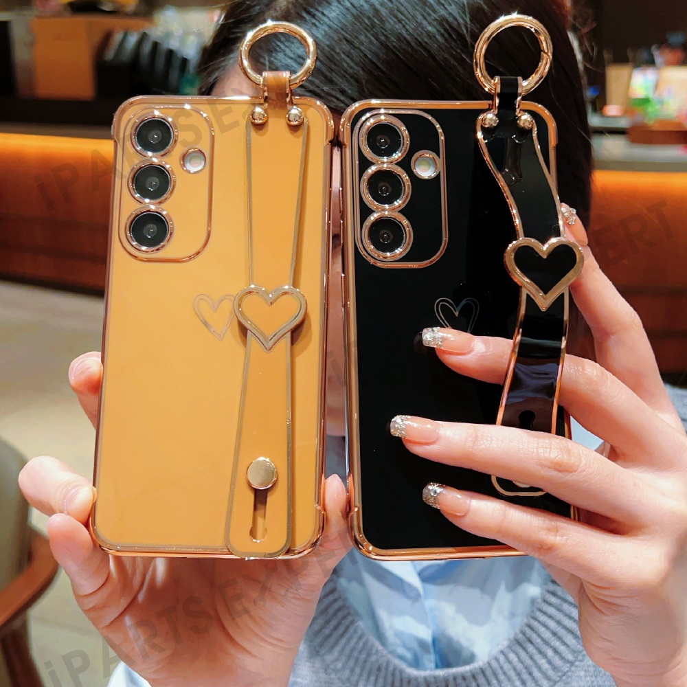 For Samsung Galaxy A16 5G / A16 4G Case Electroplated Heart Pattern TPU Phone Back Cover with Wristband Kickstand - Black