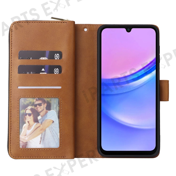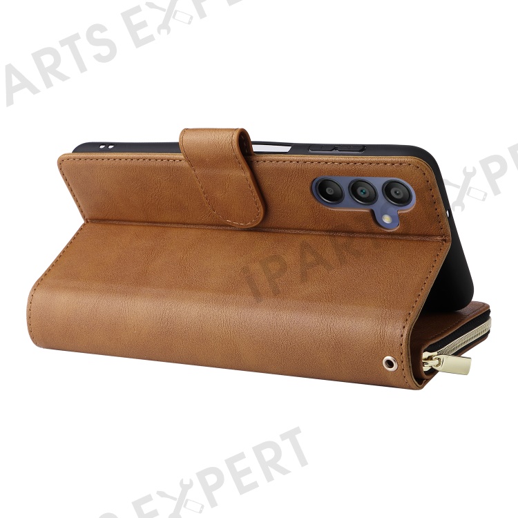 For Samsung Galaxy A16 5G / A16 4G Case Zipper Pocket PU Leather Phone Cover with Hand Strap - Brown