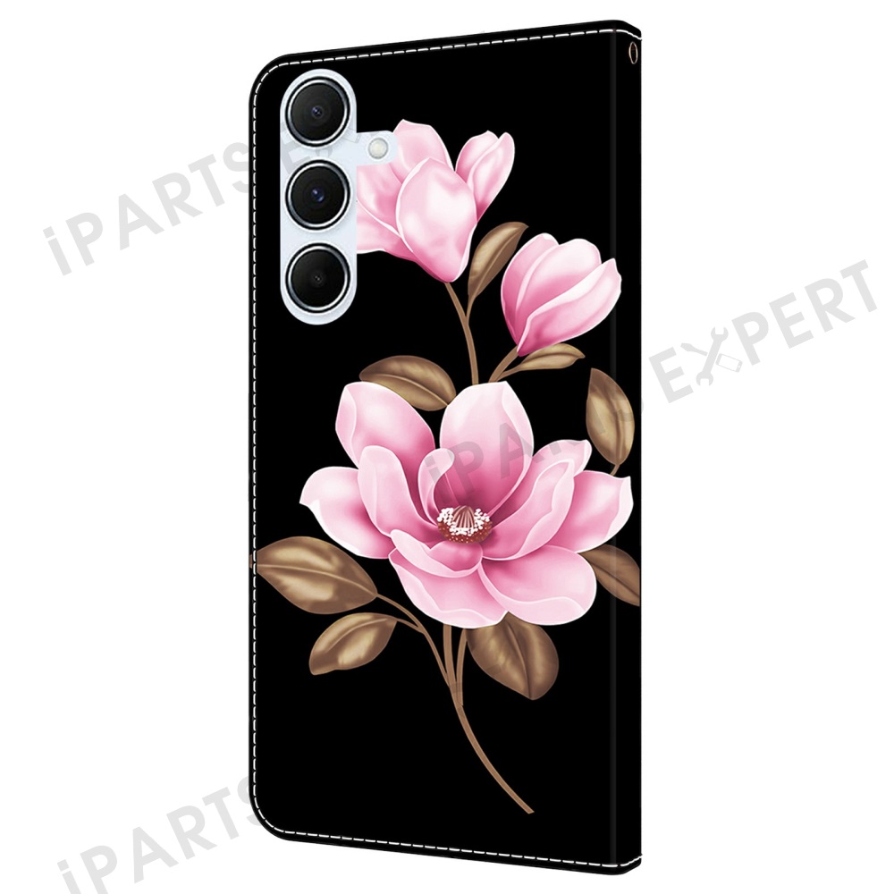 For Samsung Galaxy A25 5G (Global) (161.0 x 76.5 x 8.3mm) Case Pattern Printing Anti-Drop Leather Wallet Phone Cover - Black / Flowers