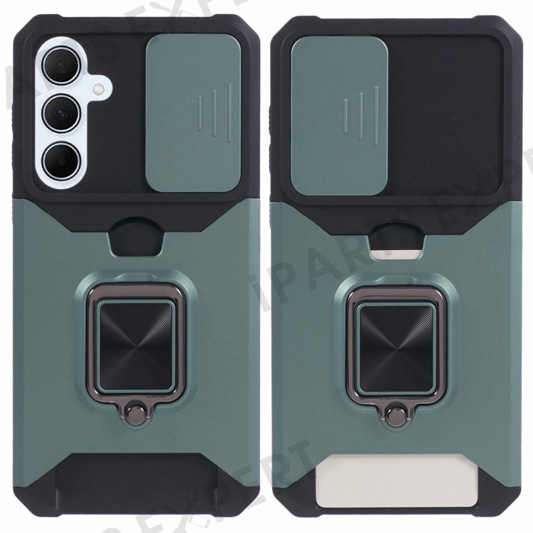 For Samsung Galaxy A35 5G Phone Kickstand Case Slide Lens Lid PC+TPU Cover with Card Holder - Blackish Green