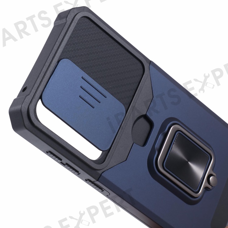 For Samsung Galaxy A35 5G Phone Kickstand Case Slide Lens Lid PC+TPU Cover with Card Holder - Navy Blue