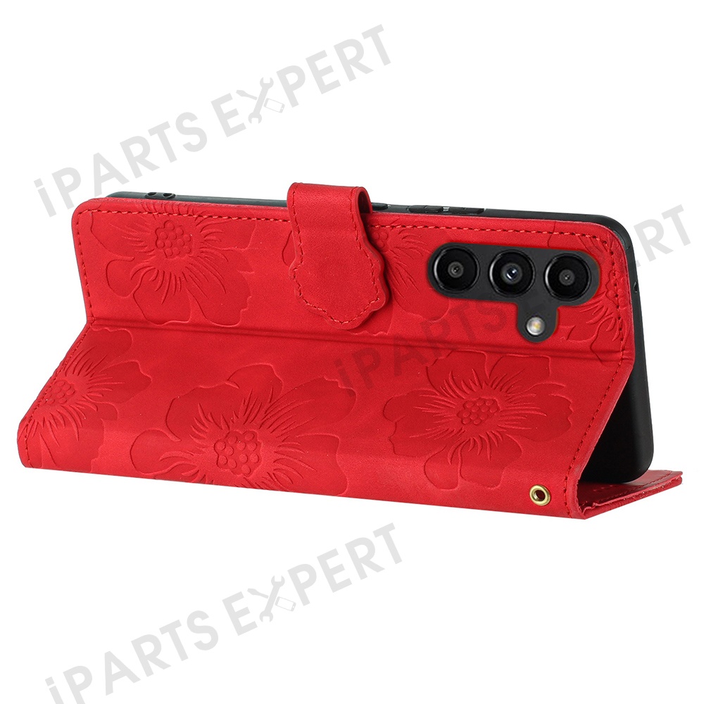 For Samsung Galaxy A36 5G Case Flower Design Leather Wallet Phone Cover with Wrist Strap - Red