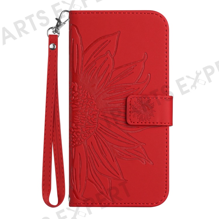 For Samsung Galaxy A52 4G / 5G / A52s 5G HT04 Skin-Touch PU Leather+TPU Phone Case Imprinted Sunflower Stand Wallet Cover with Hand Strap - Red