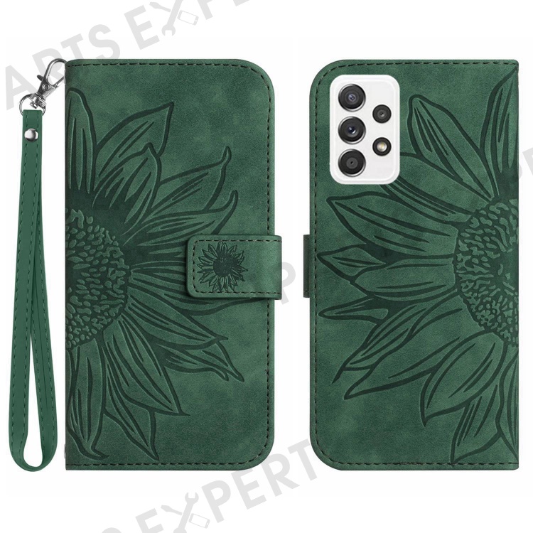 For Samsung Galaxy A53 5G HT04 Skin-Touch PU Leather Book Style Phone Case Imprinted Sunflower Stand Wallet Cover with Hand Strap - Dark Green