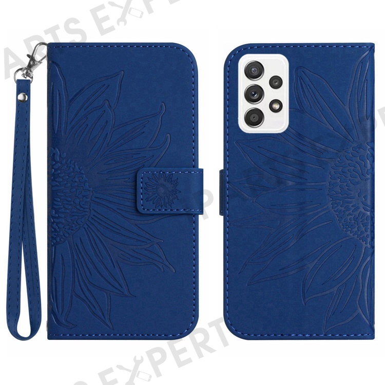 For Samsung Galaxy A53 5G HT04 Skin-Touch PU Leather Book Style Phone Case Imprinted Sunflower Stand Wallet Cover with Hand Strap - Sapphire