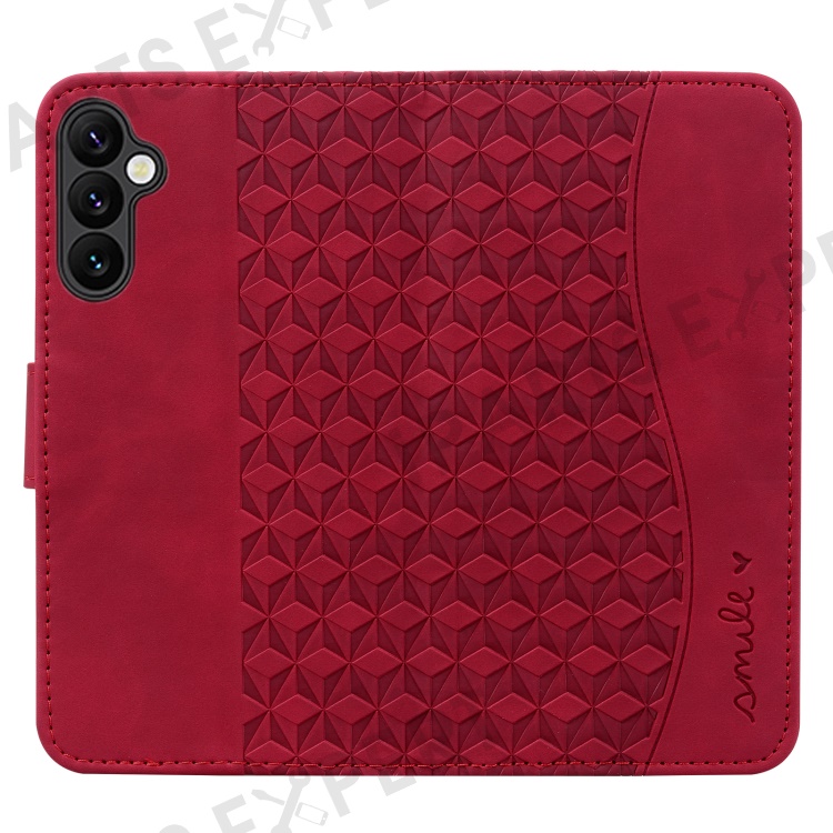 For Samsung Galaxy A55 5G Case Imprinted Rhombus Phone Wallet Cover with Hand Strap - Wine Red