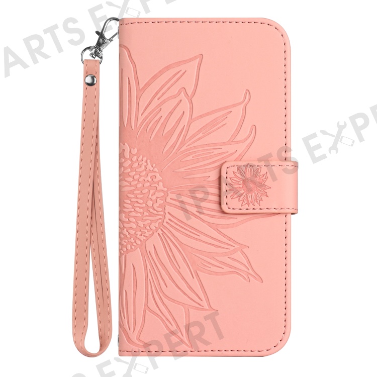 For Samsung Galaxy A72 4G / 5G Phone Case, HT04 Skin-Touch PU Leather Imprinted Sunflower Stand Wallet Cover with Hand Strap - Light Pink