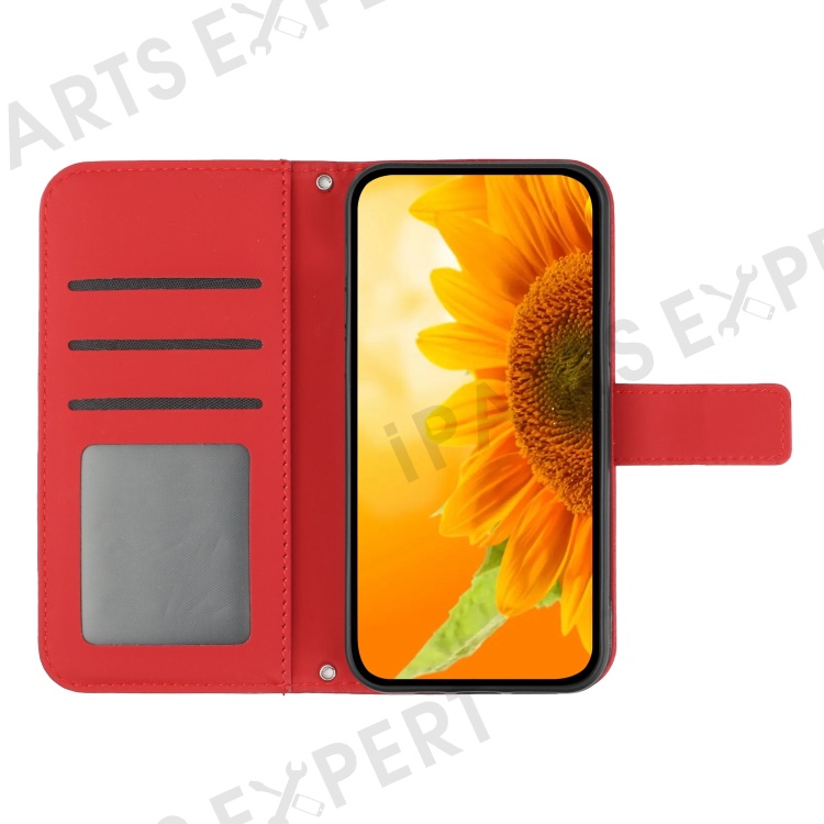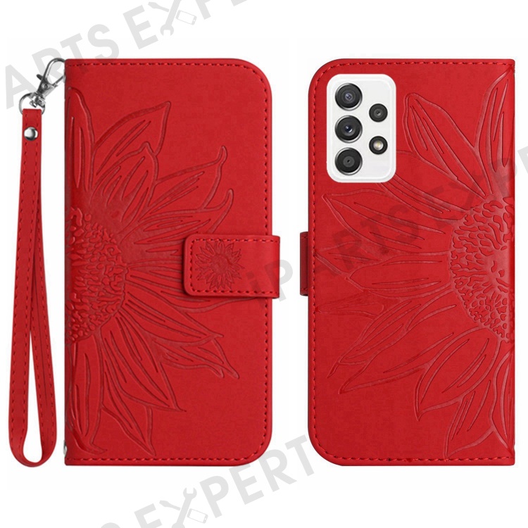 For Samsung Galaxy A72 4G / 5G Phone Case, HT04 Skin-Touch PU Leather Imprinted Sunflower Stand Wallet Cover with Hand Strap - Red